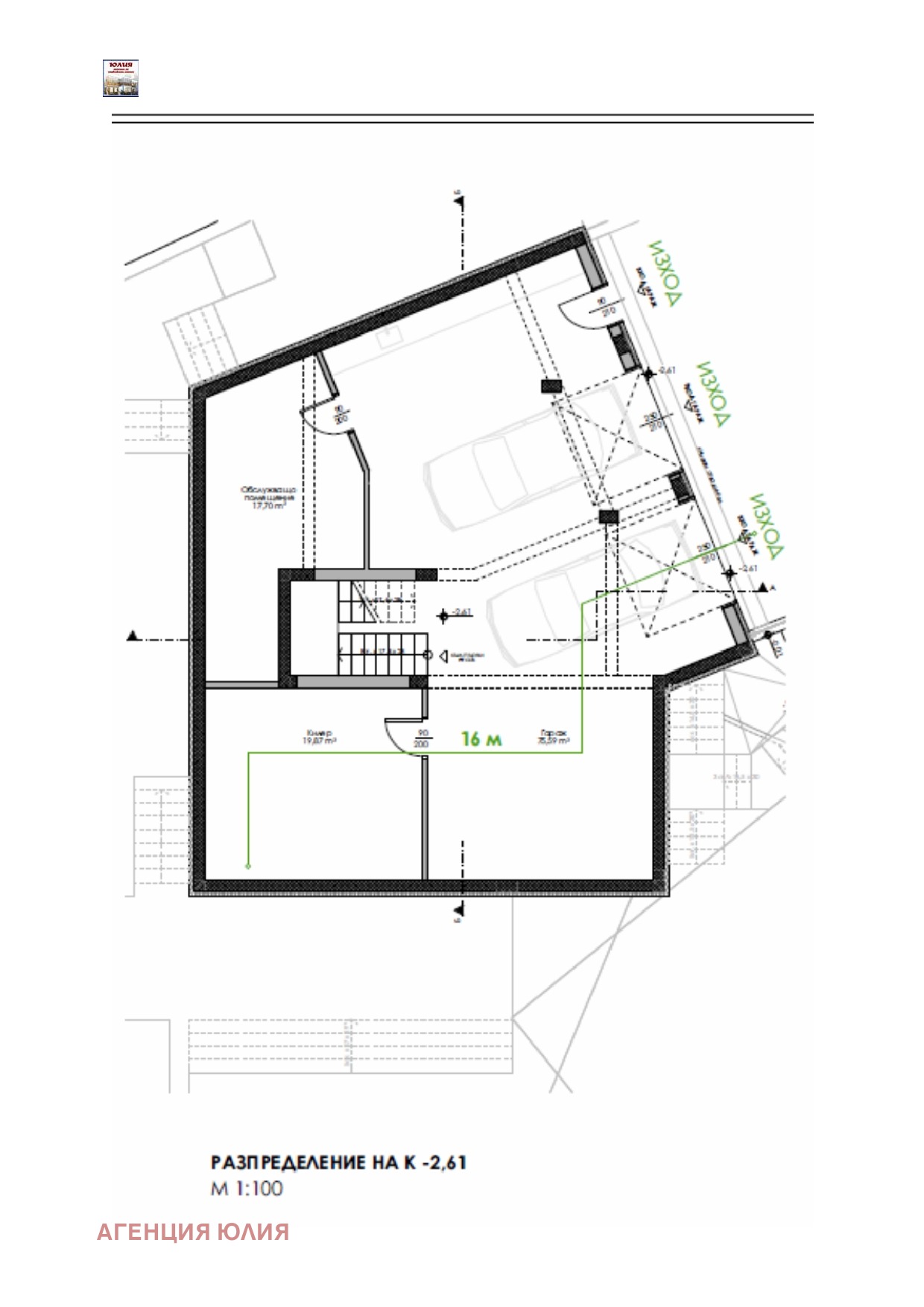 Етажното ниво на кота -2,61 е с достъп от улицата от север и се явява под нивото на прилежащия терен в останалите посоки. Състои се от обширно пространство за гариране на два автомобила и от две обслужващи помещения. Чрез вътрешно стълбище с топла връзка е осигурен достъп до къщата.