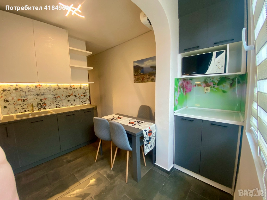 Старо строителство 3 самостоятелни стаи, балкон и баня: Кухня(12 кв.м) с трапезарна маса(приложената снимка е 3D визуализация на кухнята, тъй като е в ремонт), Хол(17 кв.м) с тв секция, диван, бюро. Спалня(17 кв.м) с място за детско легло, кростенажор, бюро или друго. Голям коридор с гардероби за багажи и портманто. Поради прехода от хол към спалня жилището не е подходящо да се дели на съквартиранти.