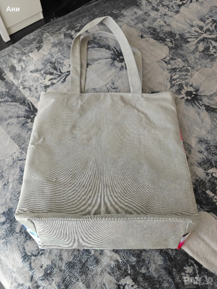 Чанта от плат с цип и цветна щампа от едната страна, останалата част е в сиво. Не е ползвана, здрава. Подплата в бежово, затваряне с цип, има и малък вътрешен джоб също с цип.