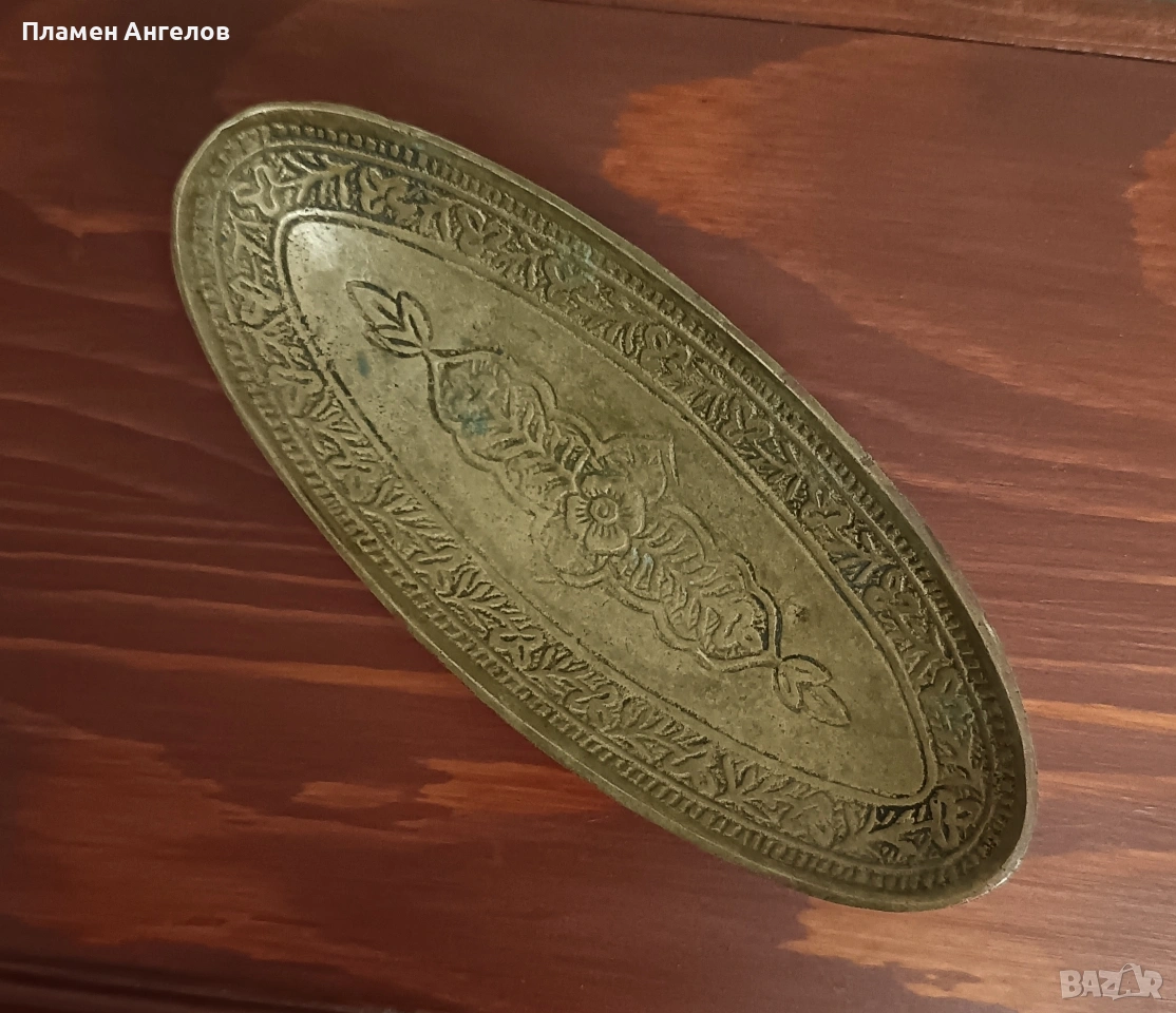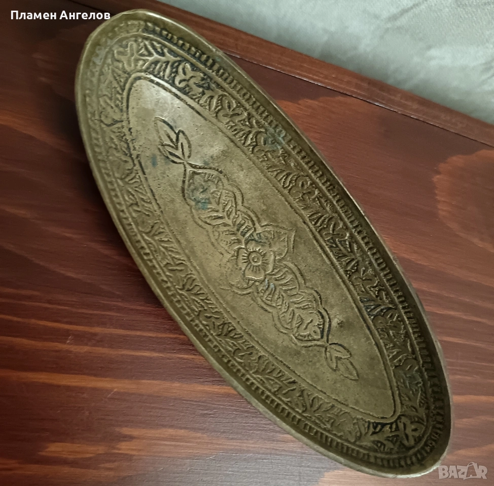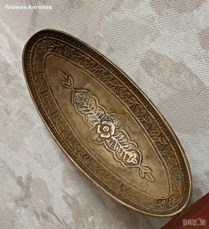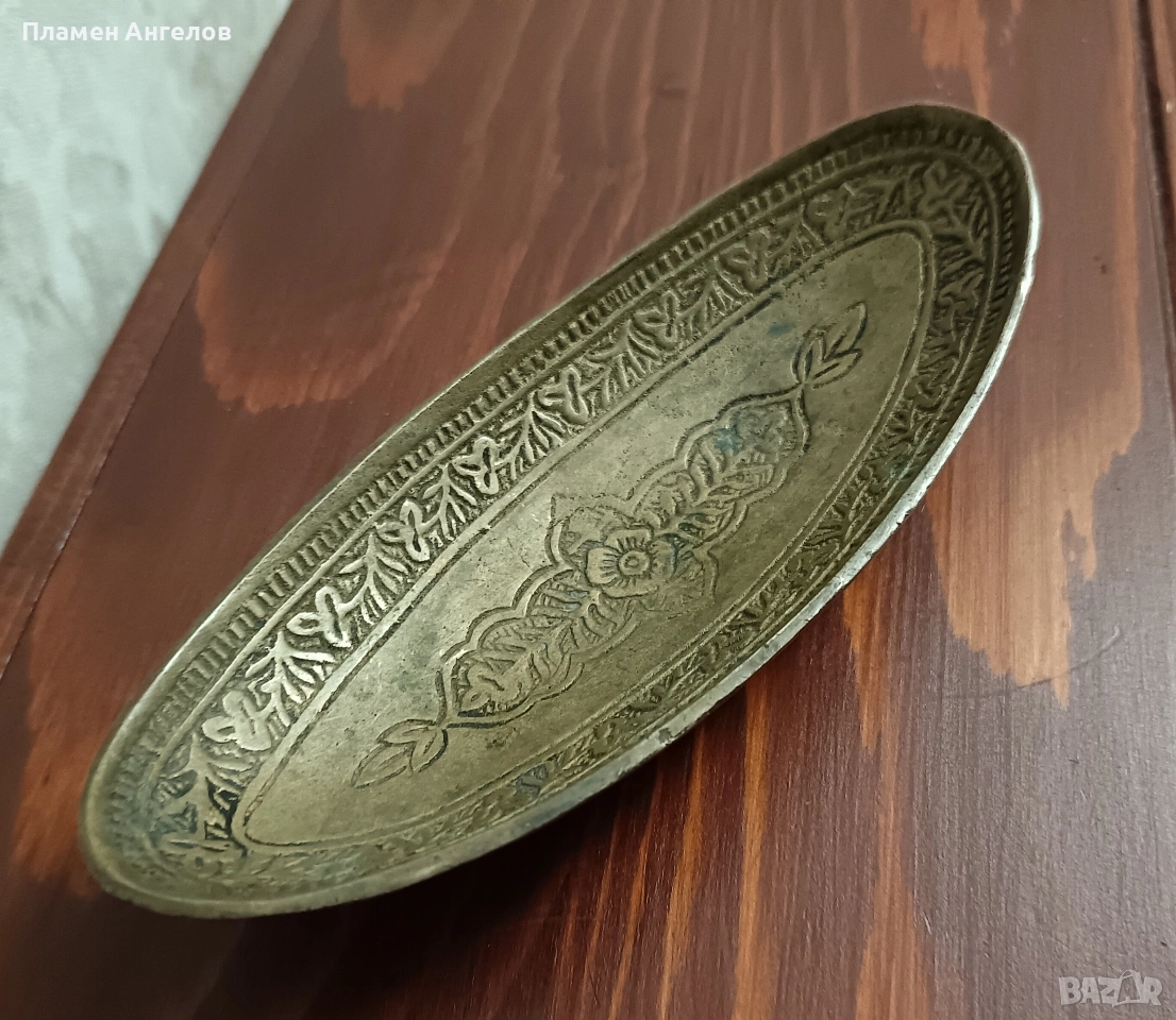 Красива декоративна паничка с овална форма, тип "лодка". Изработена от масивен месинг. Предметът е богато украсен с флорални мотиви(гравюри). За декорация, поставка за бижута, ключове или други дребни предмети. Най-често за колекции от месингови предмети. Много добро винтидж състояние с естествена патина, която придава автентичен дух. Може да се полира до блясък,който желае. От средата на 20век,произход най често от Индия или Пакистан. Дължина 17.5см.