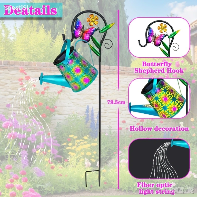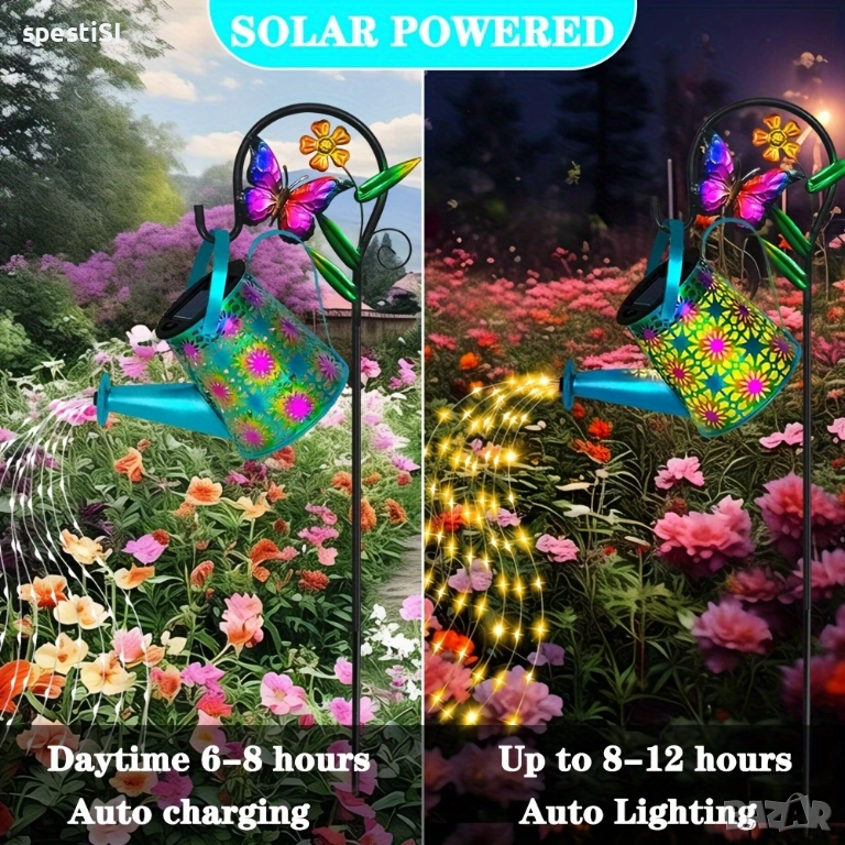Тази градинска соларна лампа е напълно автономна. Зарежда се от слънчевата светлина през деня в рамките на 6 до 8 часа. Благодарение на вградения сензор, тя се включва автоматично при стъмване и осигурява до 12 часа светлина. Комплектът е снабден с метална стойка тип кука (одобрена с декоративна пеперуда), която се забива директно в почвата за бърз и лесен монтаж, без нужда от допълнителни инструменти.