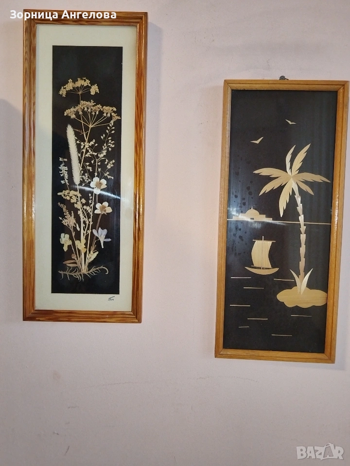Винтидж пана от втората половина на XX век Автентично немско приложно изкуство от ГДР –ръчна изработка (интарзия от слама) върху черно кадифе. Размери: 35 × 13,5 см и 32 × 13,5 см Едното пано (с цветя) има подпис/щампа на лицевата страна и маркировка на гърба.