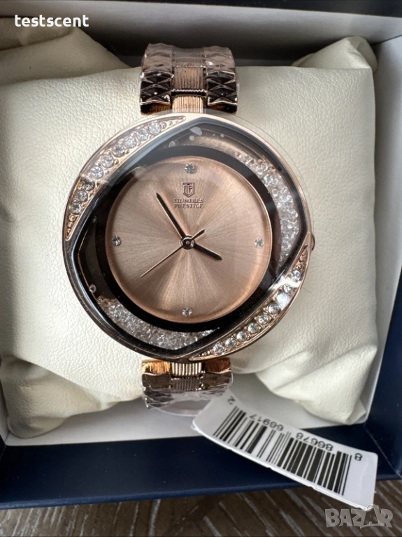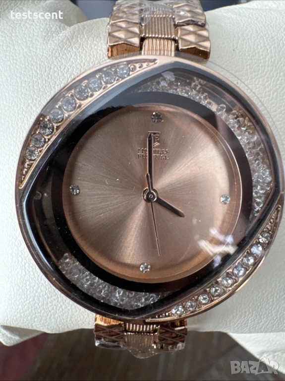 Моделът впечатлява с фин и женствен дизайн – 30 мм каса в rose gold, комбинирана с циферблат в същия топъл нюанс, украсен с деликатни CZ кристали (кубичен цирконий). Безелът е истински акцент – половината е инкрустирана с блестящи камъни, а другата половина съдържа свободно движещи се кристали, които улавят светлината при всяко движение и създават изключително ефектен блясък.