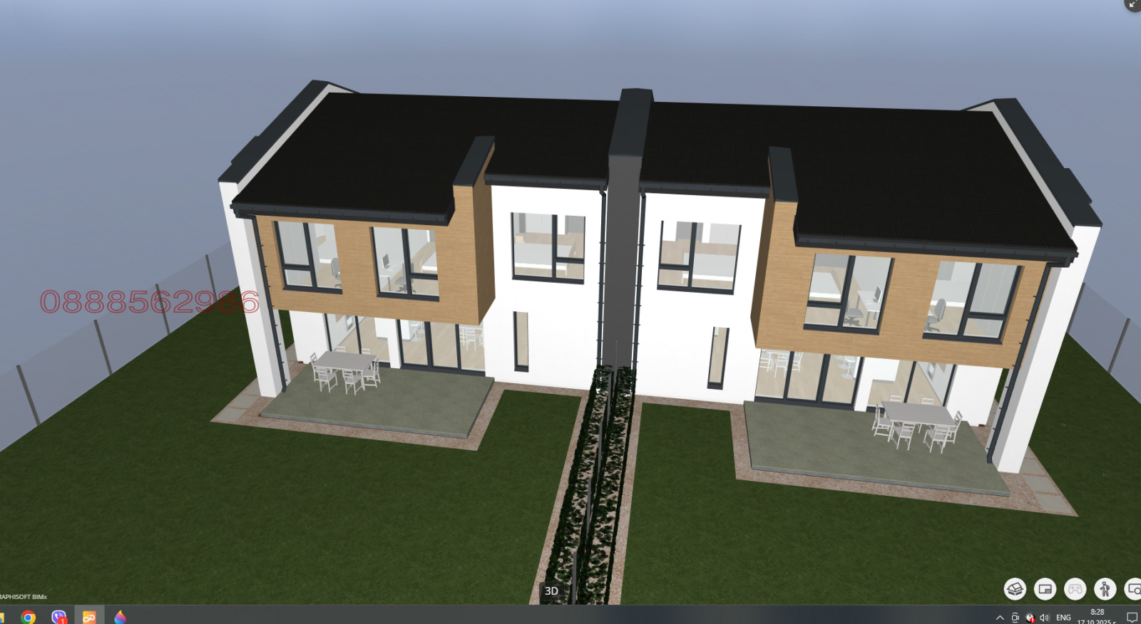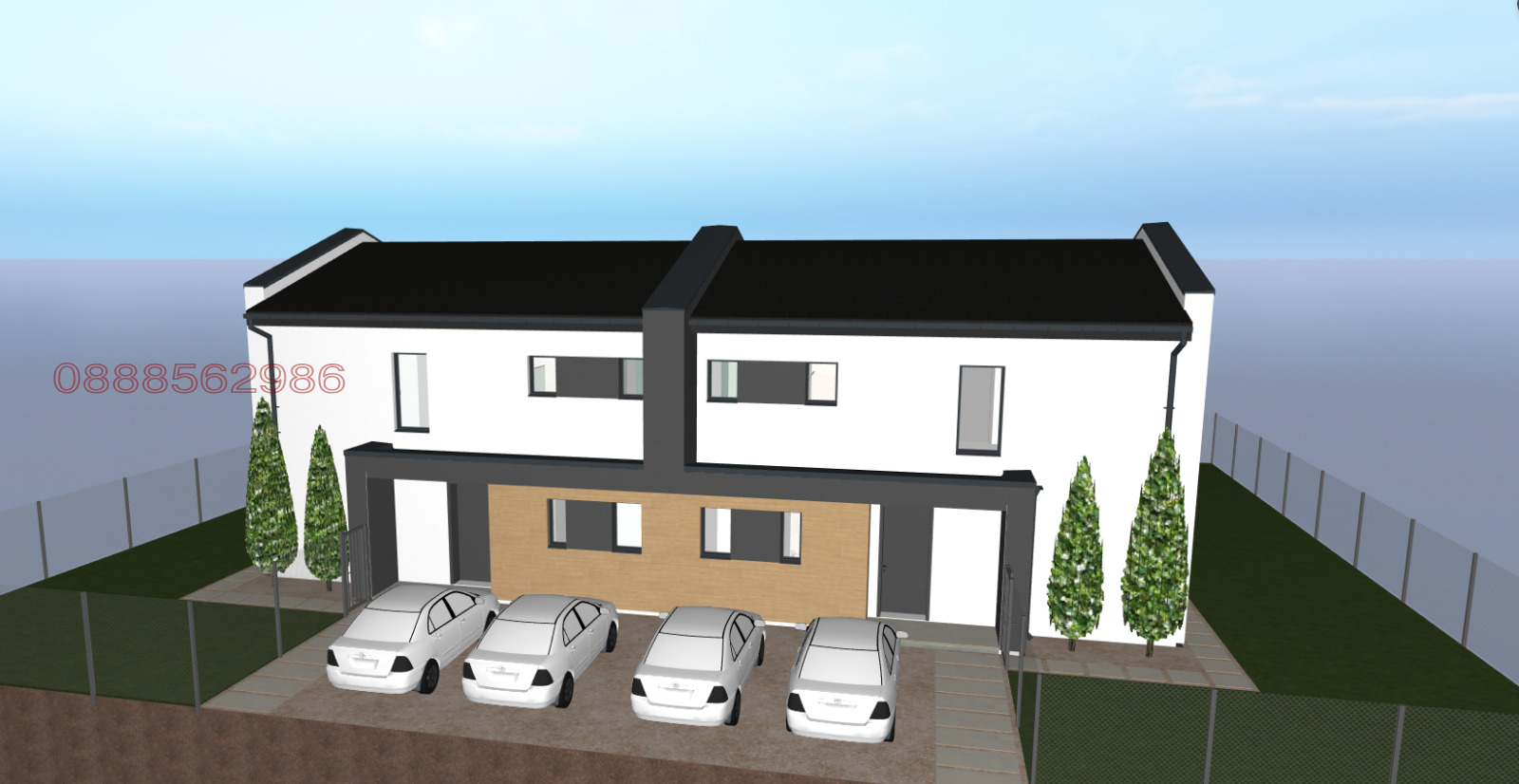 182 кв.м, 2 ет., 182 кв.м, 2 ет., От инвеститор. Без комисионна от Купувача!!!!! Продавам бутикова двуетажна къща с РЗП 182 кв.м., с Акт обр. 14 на тихо място за живеене, сред новопостроени къщи, с контролиран достъп /, Централен водопровод, ел. табло с ток в къщата, автоматична врата/ и две паркоместа. Обособен двор от 420 кв.м. + идеални части от частен път. Къщата се състои от: 1-ви етаж: -преддверие 10 кв.м от което тръгва стълбата за втория етаж; дневна с трапезария и кухненски бокс 42 кв.м.; тоалетна 2,05м2; склад 6.07 м2; покрита веранда 17.94м2 , 2-ри етаж: три спални /13 кв.м; 13 кв.м и 15 кв.м./ ; два санитарни възела и перално помещение. Констуктивното изпълнение включва стомано-бетоннен скелет, ТРИ плочи с двускатен покрив Tondach. Обявената цена е при продажба на къщата в груб строеж с 5 камерна PVC Deceuninck с троен стъклопакет с подписан Акт обр.14. -187 000 евро. В завършен вид с 'Разрешение за ползване' ще бъдат изградени външни огради, фасадна система Baumit, блиндирана входна врата, ел. до ключ, ВиК до тапа. Къщата се издава по БДС стандарт тел.: 0888562986, тел.: 0886422777