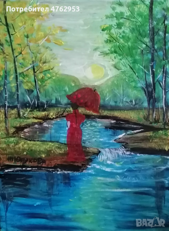 Творбата улавя миг на тихо съзерцание край реката. Фигурата