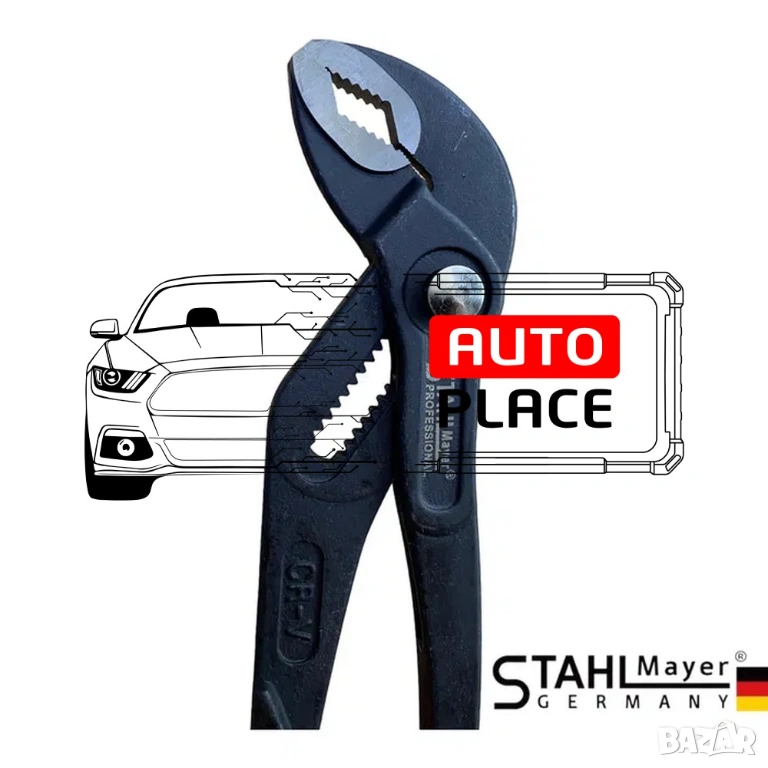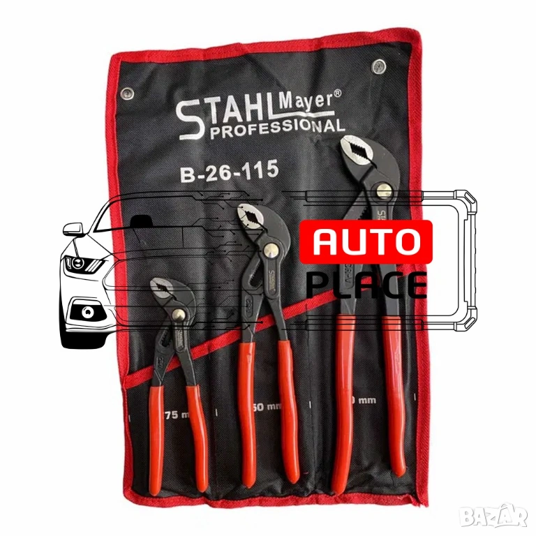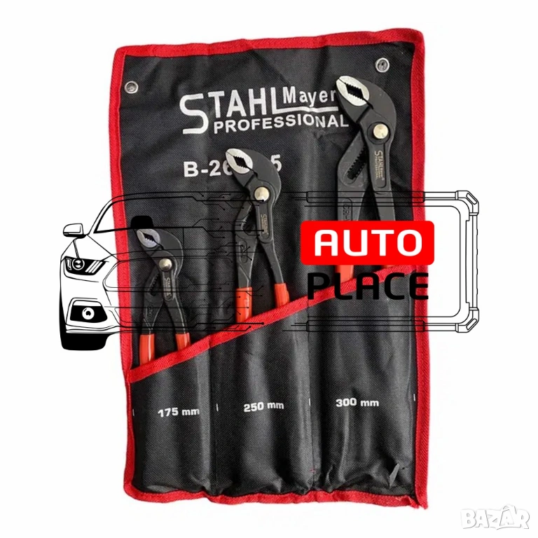 Водопроводни клещи с не плъзгащи се пластмасови дръжки, в полиестерен калъф. Комплект клещи гарги STAHLMAYER се състои от 3 инструмента с дължина съответно 175 /250 / 300 мм. Положението на челюстта се регулира с бутон, който осигурява фина настройка за оптимално адаптиране към детайли. Изработени са от хром-ванадиева стомана. Разполагат с не плъзгащи се пластмасови дръжки. Доставят се в полиестерен калъф.