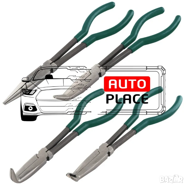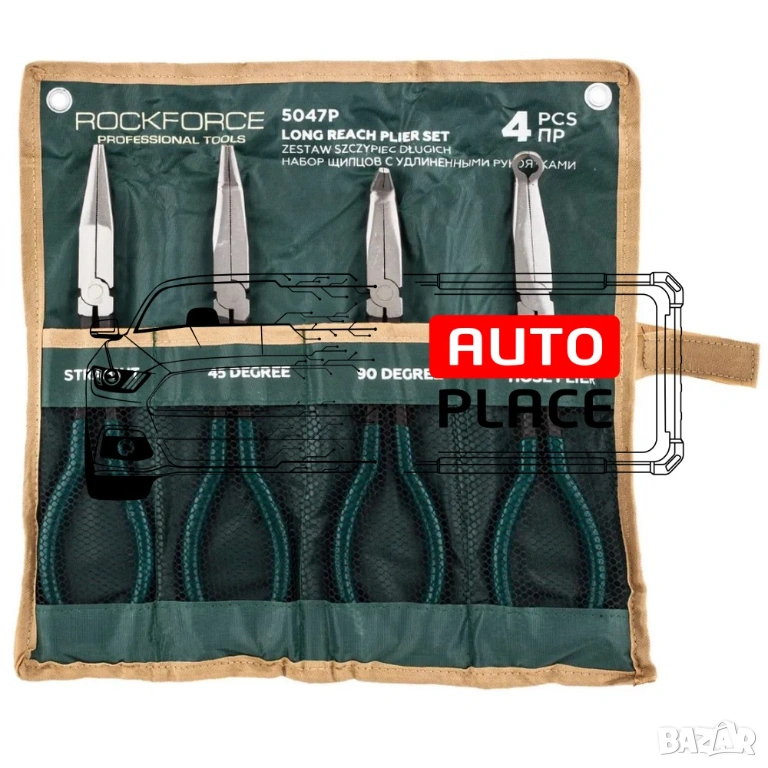 Комплектът включва 4 различни вида клещи – прави, под 45°, под 90° и клещи за маркучи, подредени в удобен текстилен калъф за съхранение и пренасяне.