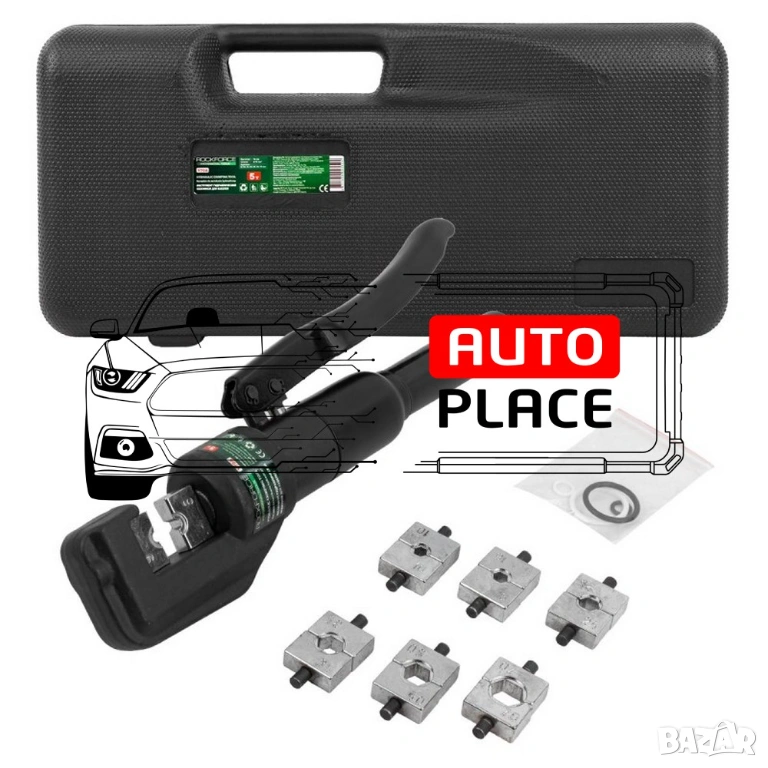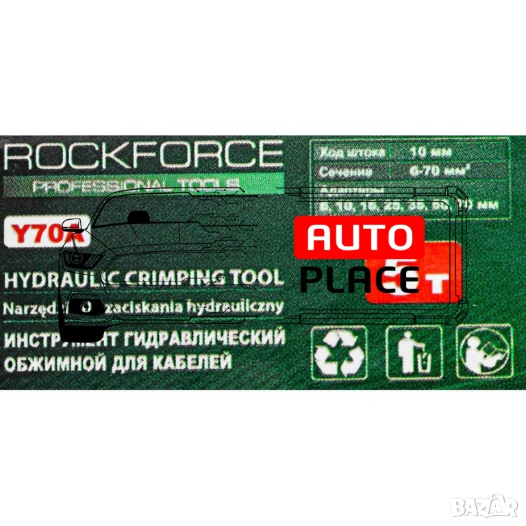 Хидравлични кримпващи клещи подходящи за шестоъгълни кабелни проводници. Хидравлични клещи за кербоване RockForce RF-Y70А имат автоматичен профил за налягане и пресоване със сила 5 т. Подходящи са за шестоъгълни кабелни проводници. Клещите са снабдени с въртяща се на 360° глава за работа на труднодостъпни места. В комплект с матрици за пресоване 6,10,16,25,35,50,70 мм². Доставя се в практичен пластмасов куфар за пренос и съхранение.