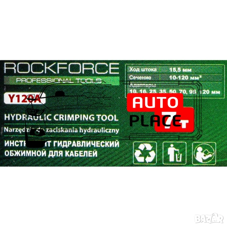 Хидравлични кримпващи клещи подходящи за шестоъгълни кабелни проводници. Хидравлични клещи за кербоване RockForce RF-Y120А имат автоматичен профил за налягане и пресоване със сила 7 т. В комплект с матрици за пресоване 10,16,25,35,50,70,95,120 мм². Доставя се в практичен пластмасов куфар за пренос и съхранение.