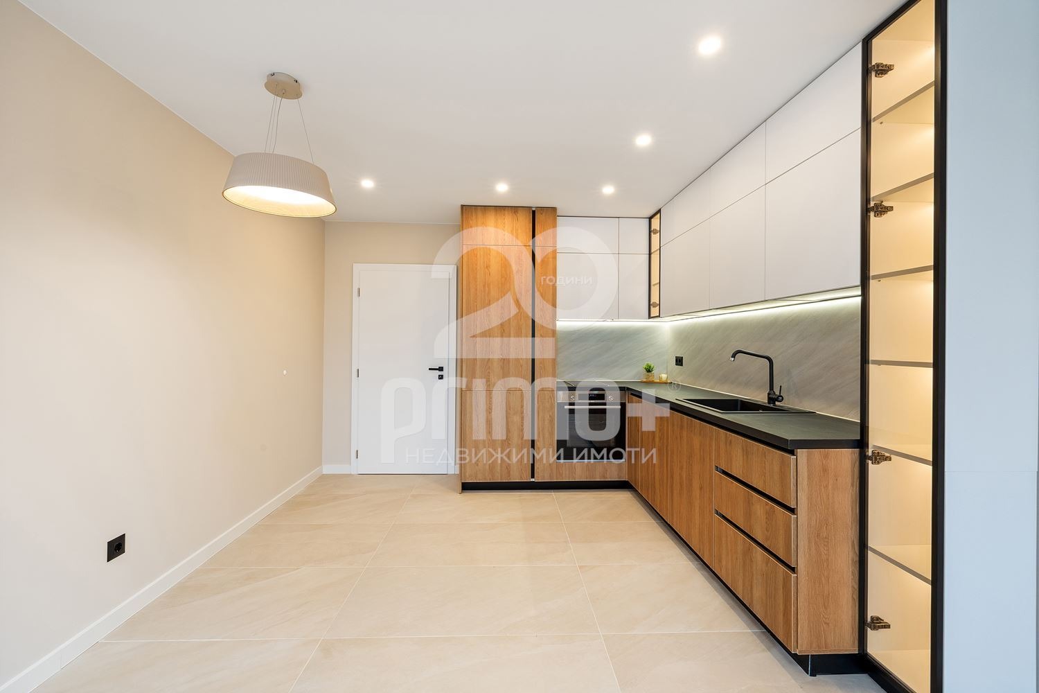 Кухня и мебелировка: съвременен и функционален дизайнерски проект, оборудван с висок клас вградени електроуреди BOSCH (фурна, съдомиялна и котлони), хладилник Samsung и мебели по поръчка. В коридора е поставен вграден гардероб по поръчка.