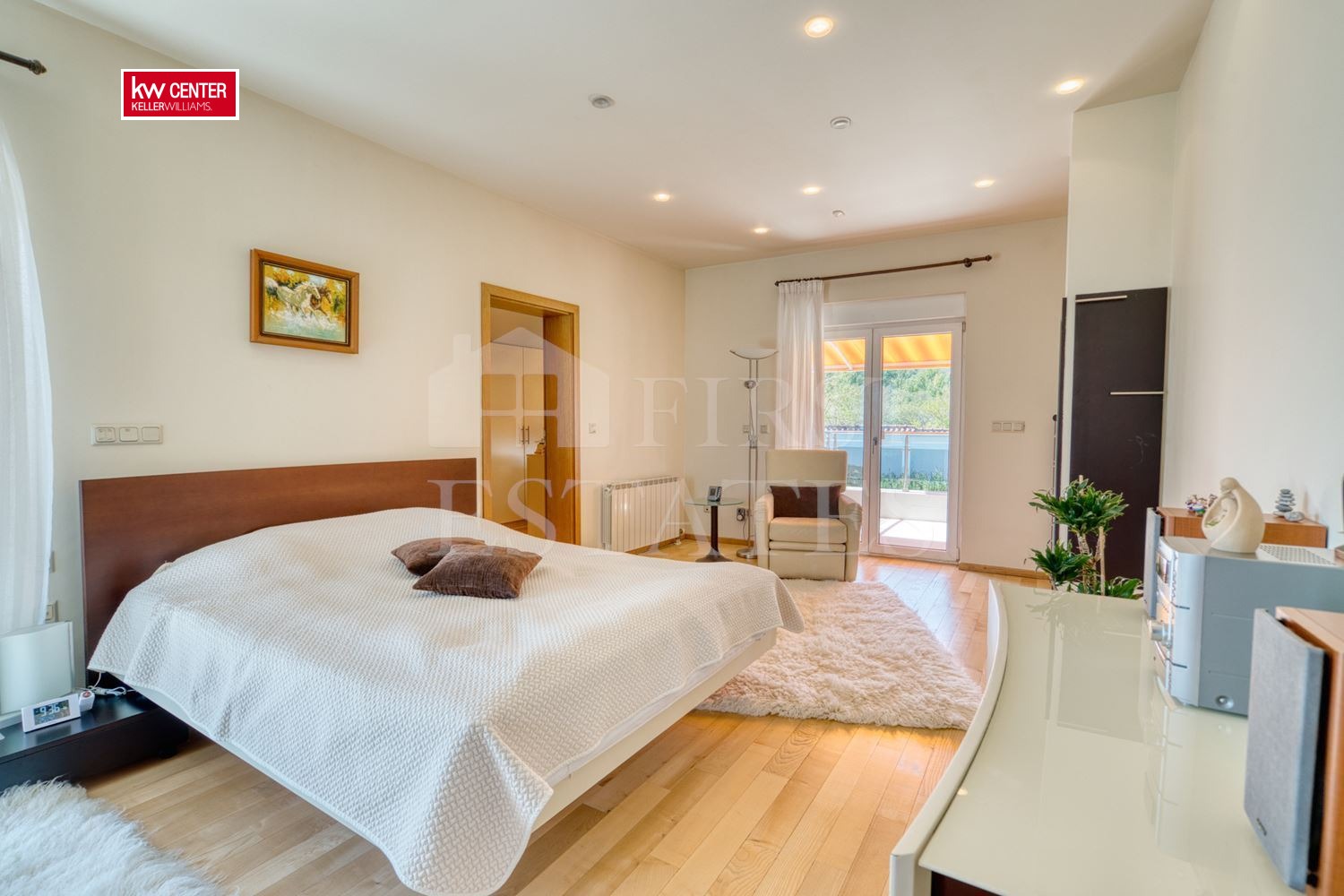 отделна кухня с два вградени хладилника Liebherr, вградена печка, микровълнова и миялна Siemens, индукционен плот Bosch, каменен стенен аспиратор Siemens, вградена в чекмедже машина за рязане.