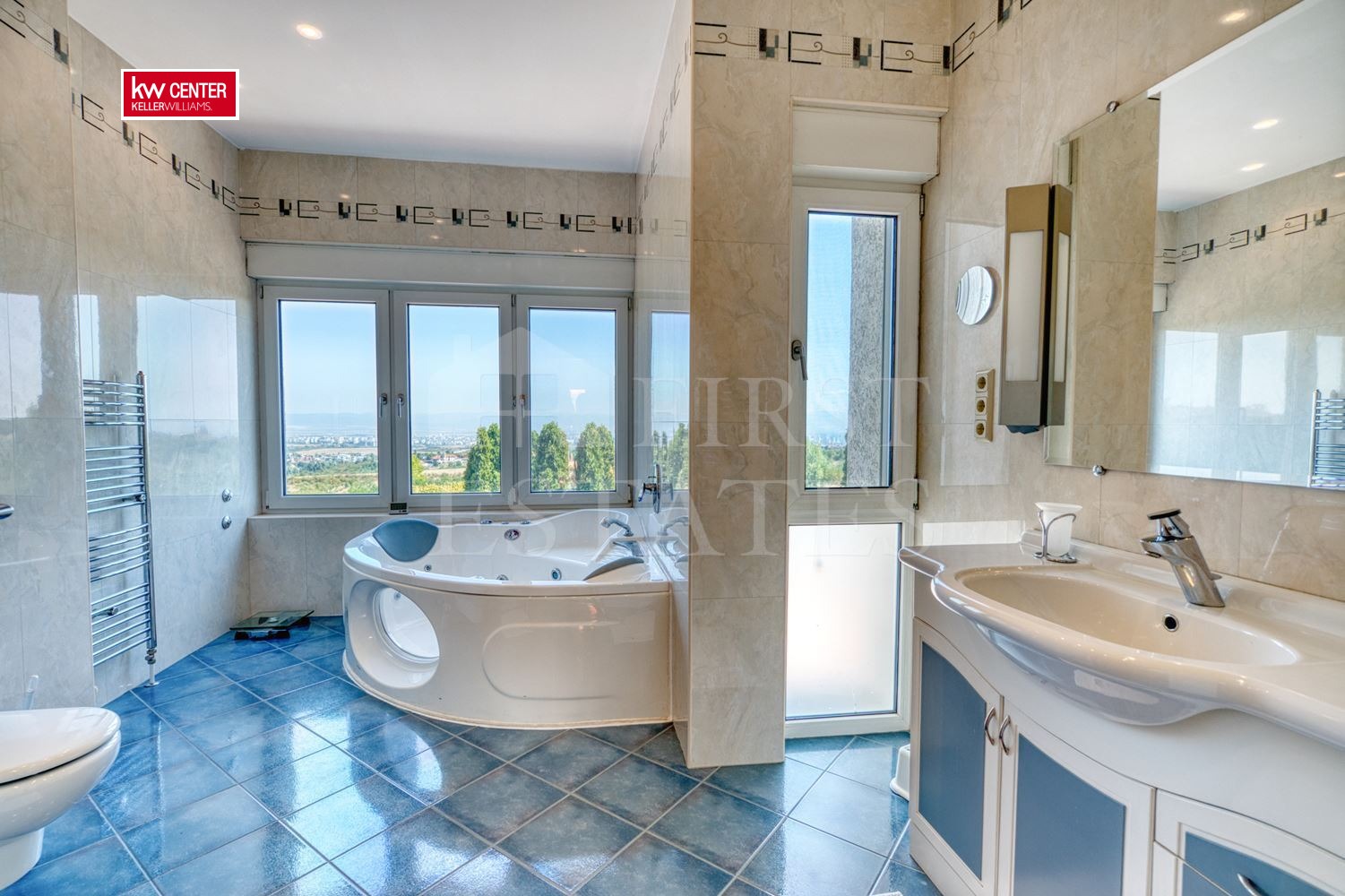 спалня родителска с гардеробно помещение и собствена баня с тангенторна вана, душ кабина, тоалетна, мивка и панорамни прозорци, самостоятелен балкон с панорамна гледка към София