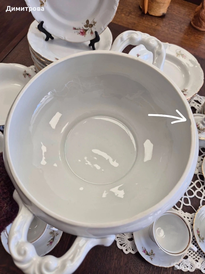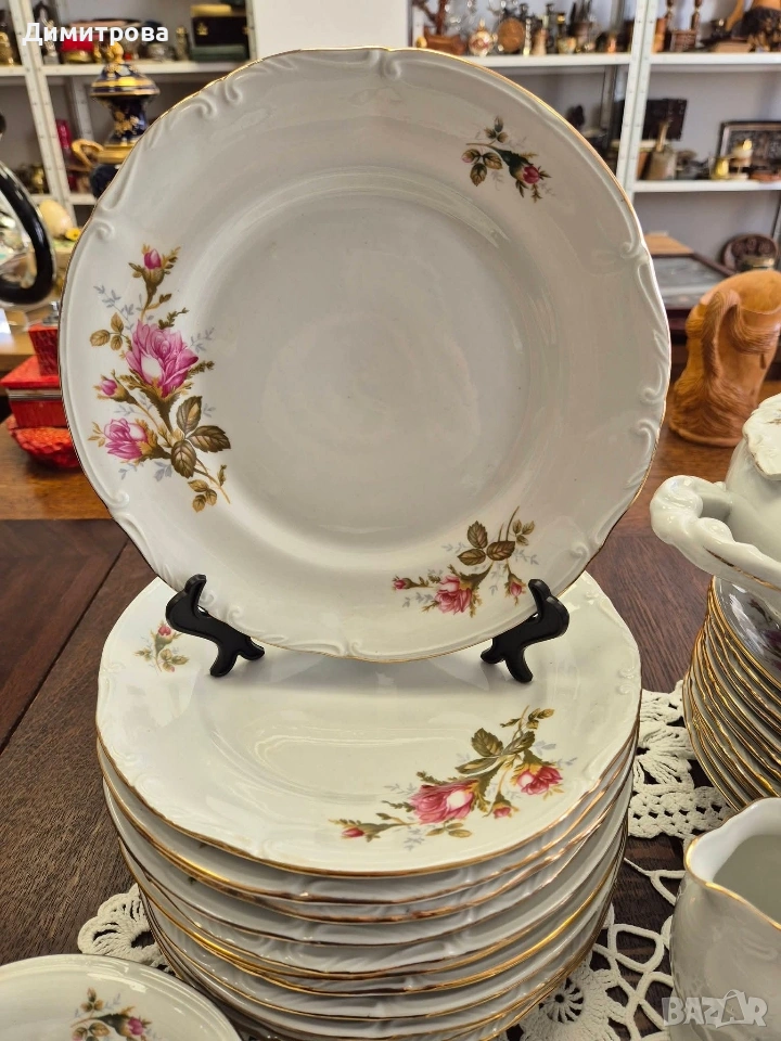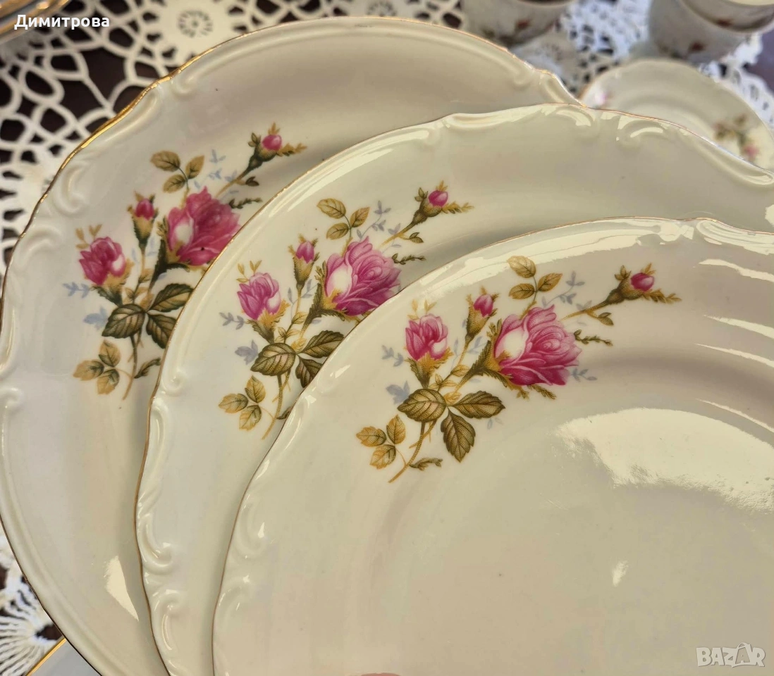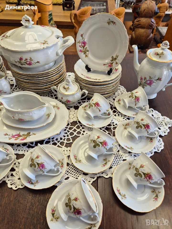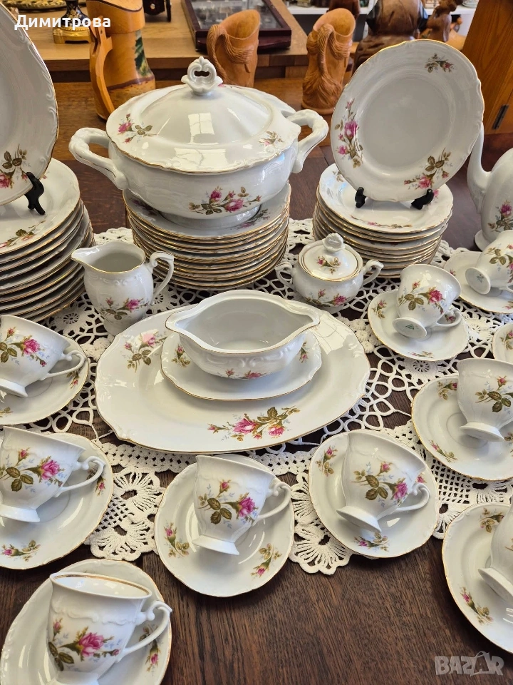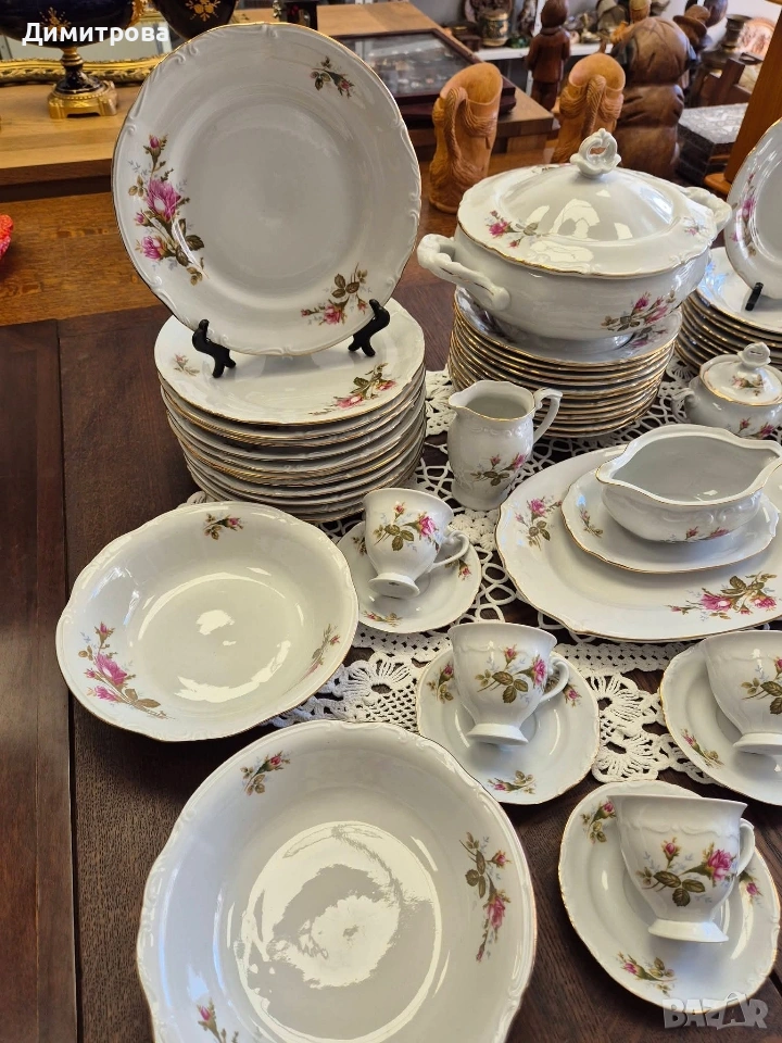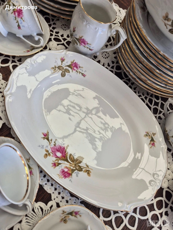Представям на вашето внимание един изключителен сервиз на световно известната марка Chodziez, Poland. Дизайнът от нежни розови рози и фини златни кантове са абсолютната класика, която ще внесе много красота и уют във вашият дом. Декорът е двустранен, имат си и релефна орнаментика, която ги прави още по- елегантни и красиви. 🌹 Съдържа : 🌹 1 брой супник ф 21,5см.( без дръжките), h 11см./ 17см.до връх 🌹 1 брой плато елипса 33см./ 22,5см. 🌹 2 броя купи ф 22,5см., h 5,5см. 🌹 1 брой сосиера с прикрепена подложна чиния 20см./ 14см. 🌹 12 броя чинии порция ф 24,3см. 🌹 12 броя чинии супа ф 23см., h 3,5см. 🌹 12 броя чинии салата/ десерт ф 19,2см. 🌹 1 брой чайник 🌹 1 брой захарница 🌹 1 брой каничка за мляко 🌹 11 броя подложни чинийки ф 13,5см. 🌹 11 броя чашки, вместимост 150мл.до ръбче. Като цяло сервизът е без следи от употреба, но ще посоча следните забележки : - отлюспено от ръба на супника, при затворен капак не се вижда; - на една основна чиния има пукнатина; - на две от дълбоките има малки чипчета по ръба; - на две от салатните има чипчета, на едната е по ръба, на другата съвсем минимално отдолу; Всичко е отразено в снимки. 🌹 Цена 210 € /410,72лв.
