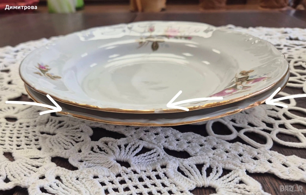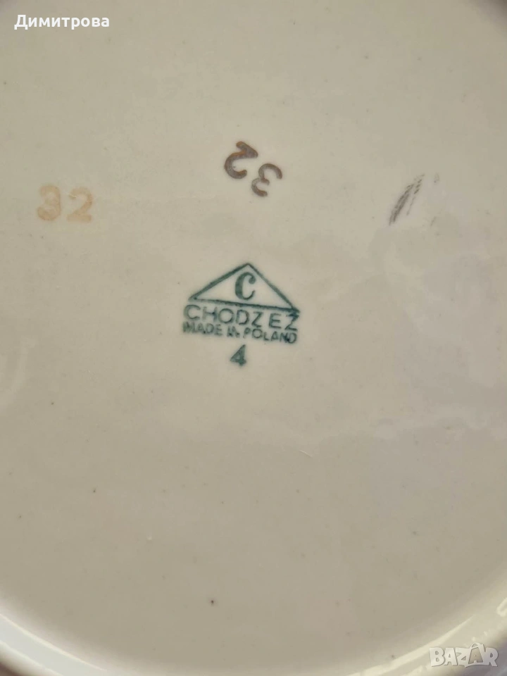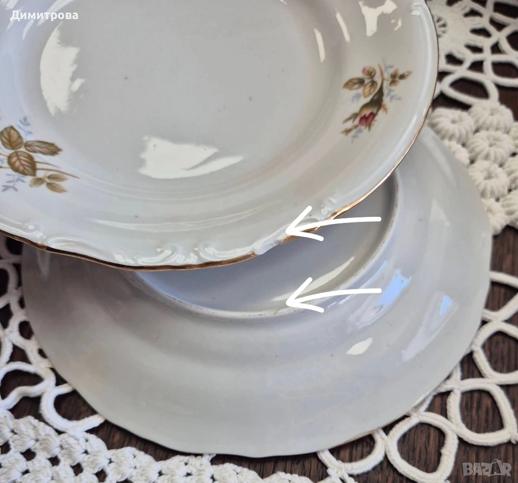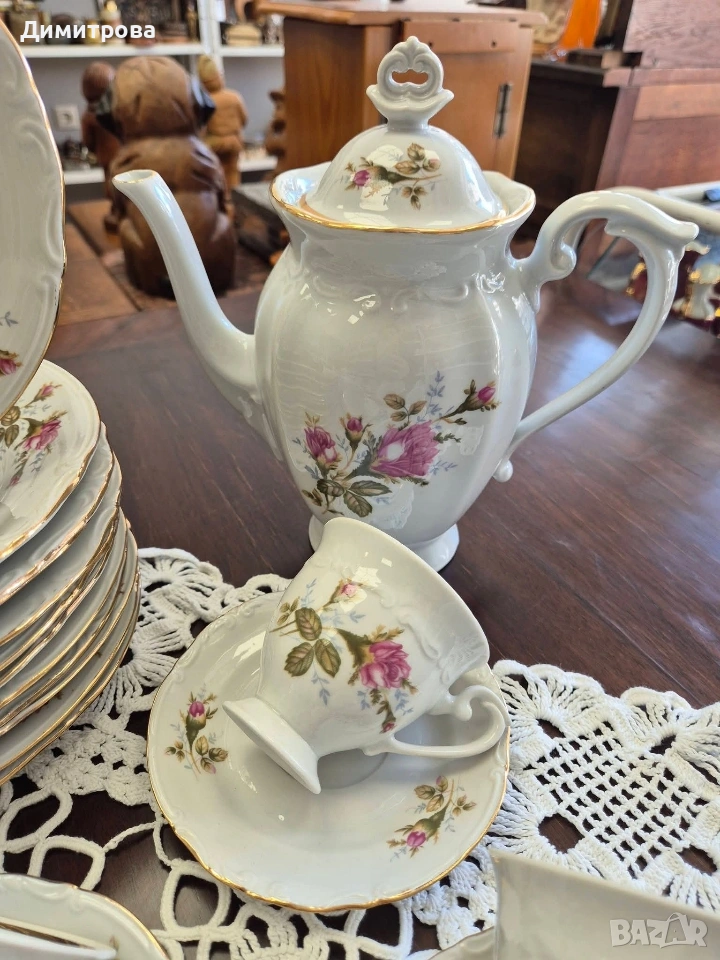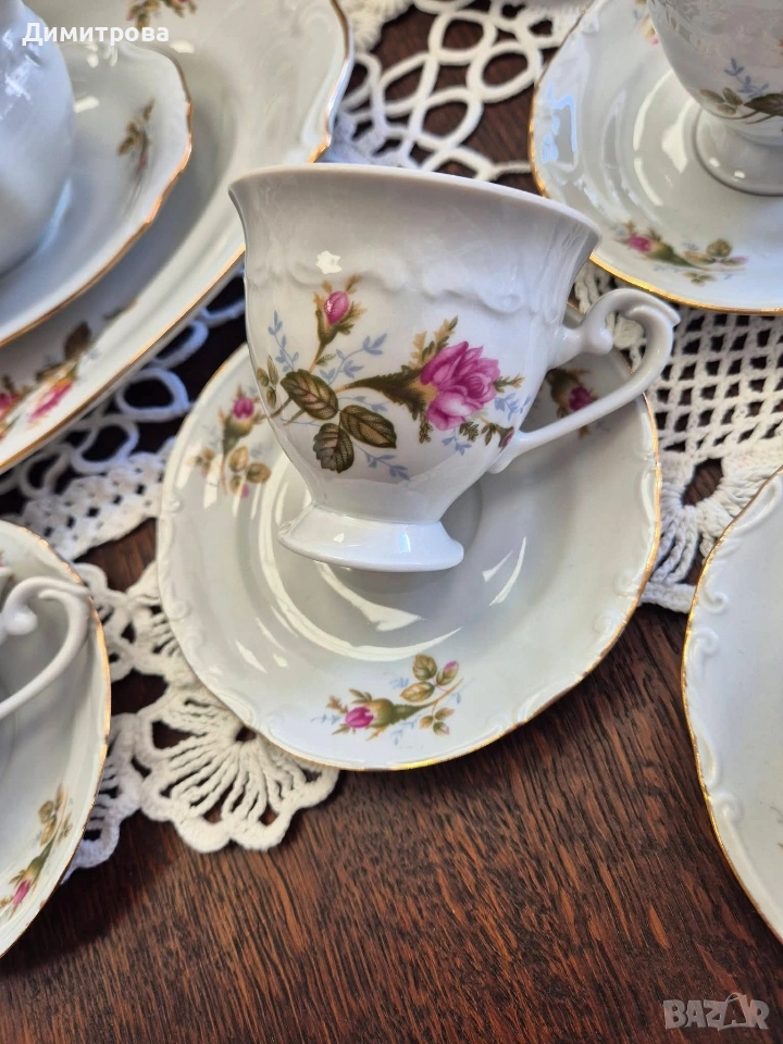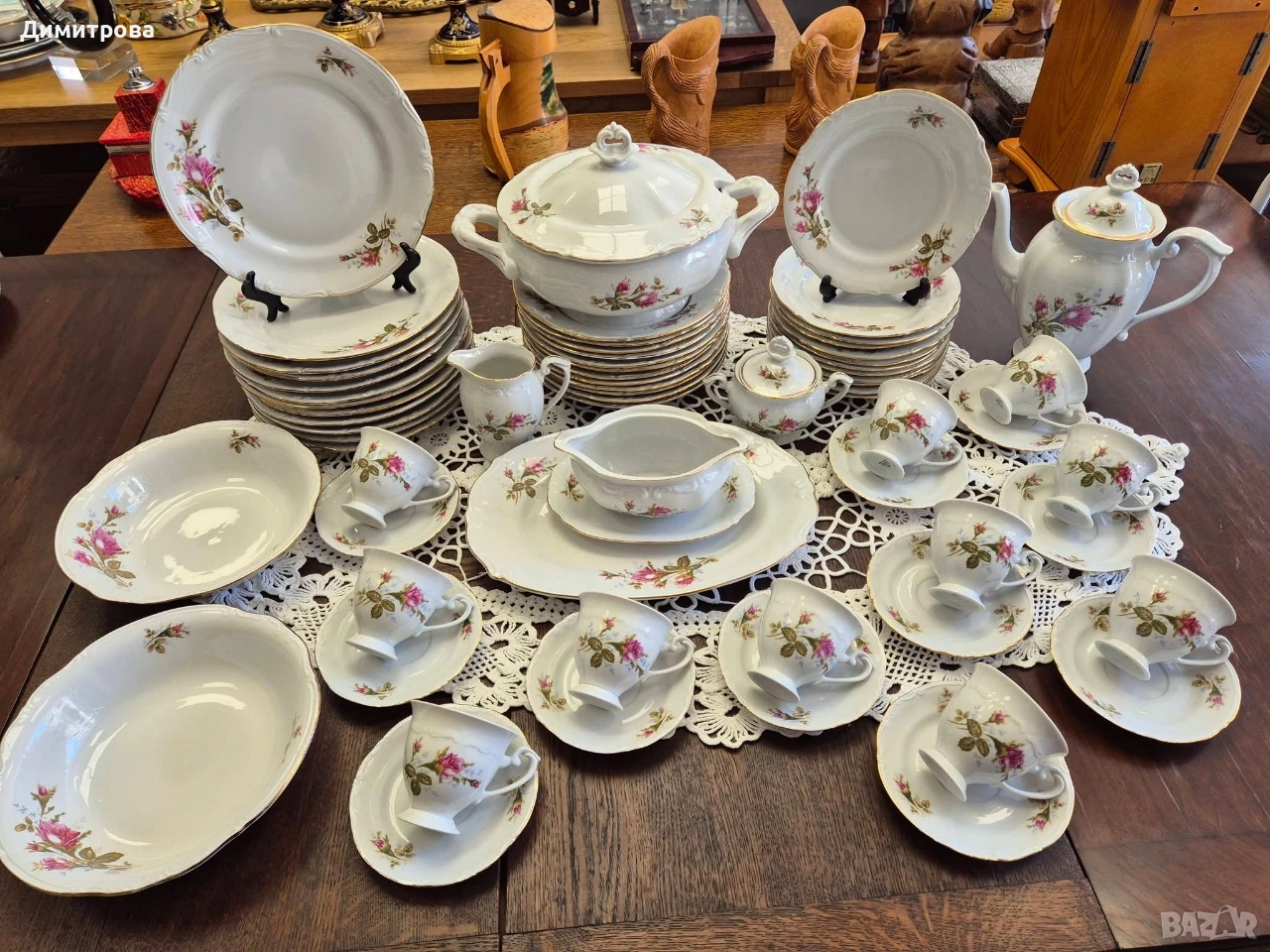 Представям на вашето внимание един изключителен сервиз на световно известната марка Chodziez, Poland. Дизайнът от нежни розови рози и фини златни кантове са абсолютната класика, която ще внесе много красота и уют във вашият дом. Декорът е двустранен, имат си и релефна орнаментика, която ги прави още по- елегантни и красиви. 🌹 Съдържа : 🌹 1 брой супник ф 21,5см.( без дръжките), h 11см./ 17см.до връх 🌹 1 брой плато елипса 33см./ 22,5см. 🌹 2 броя купи ф 22,5см., h 5,5см. 🌹 1 брой сосиера с прикрепена подложна чиния 20см./ 14см. 🌹 12 броя чинии порция ф 24,3см. 🌹 12 броя чинии супа ф 23см., h 3,5см. 🌹 12 броя чинии салата/ десерт ф 19,2см. 🌹 1 брой чайник 🌹 1 брой захарница 🌹 1 брой каничка за мляко 🌹 11 броя подложни чинийки ф 13,5см. 🌹 11 броя чашки, вместимост 150мл.до ръбче. Като цяло сервизът е без следи от употреба, но ще посоча следните забележки : - отлюспено от ръба на супника, при затворен капак не се вижда; - на една основна чиния има пукнатина; - на две от дълбоките има малки чипчета по ръба; - на две от салатните има чипчета, на едната е по ръба, на другата съвсем минимално отдолу; Всичко е отразено в снимки. 🌹 Цена 210 € /410,72лв.