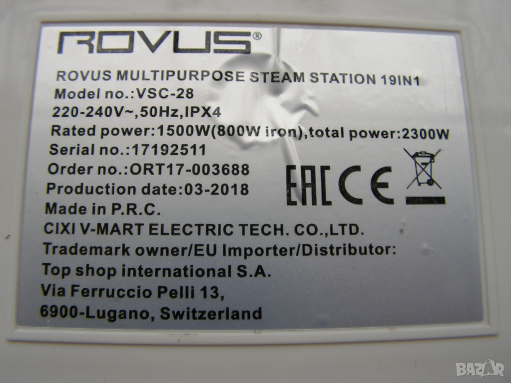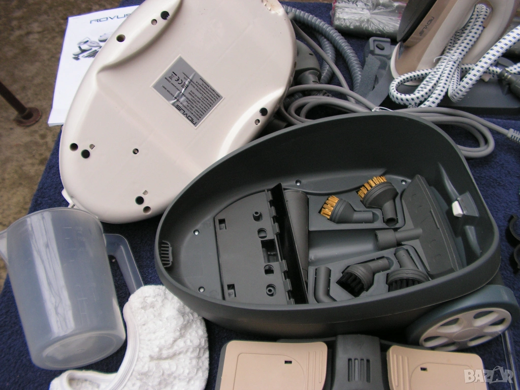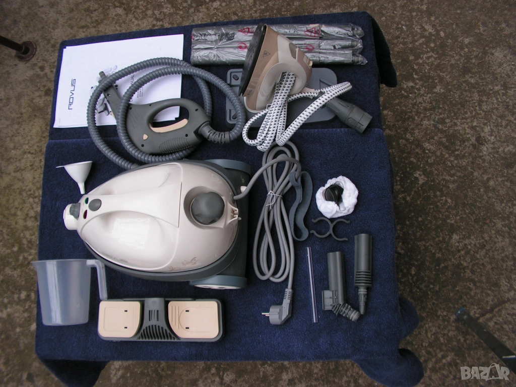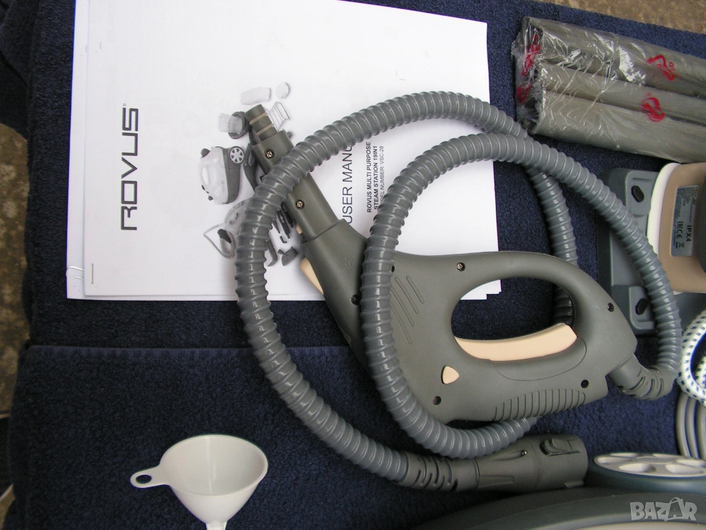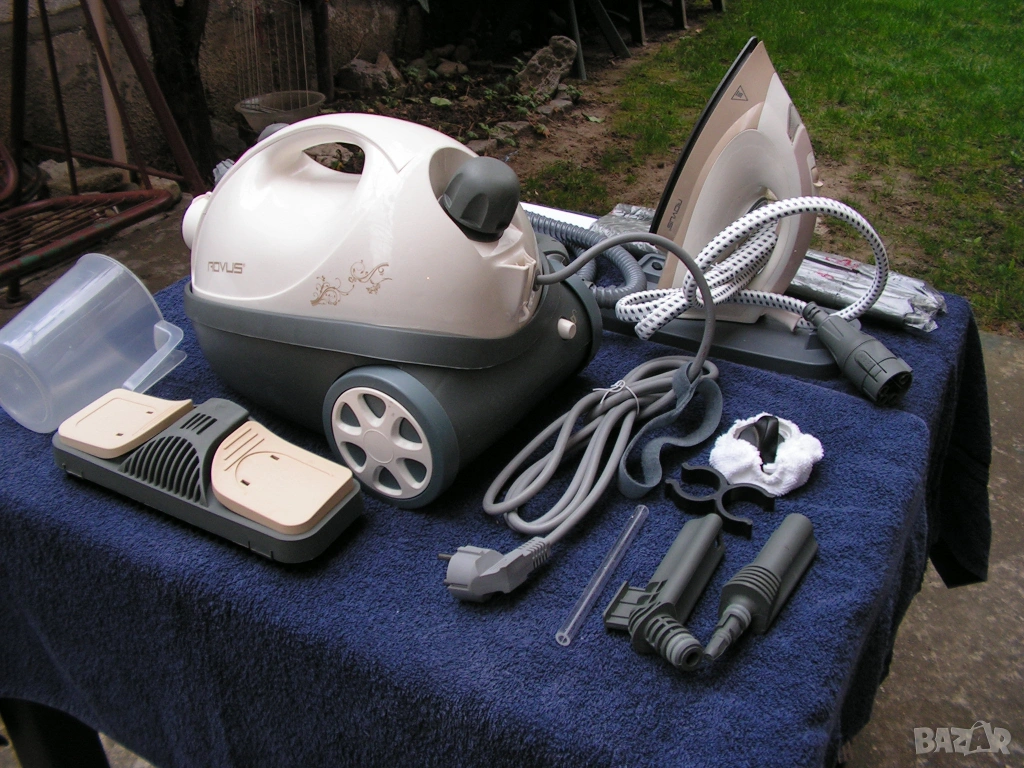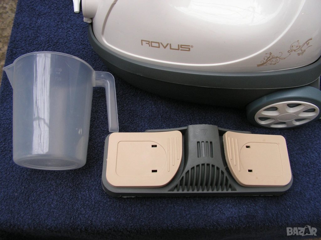 повърхности и текстил, без използването на вредни химикали. Осигурява качествено почистване на подове, почистване и дезинфекция на килими и премахване на упорити петна . Ръчния парен пистолет може да използвате за почистване на труднодостъпни места. Идеален за плочки, скари, котлони и фурни. Също за премахване на петна от дрехи и текстил и дори почистване на прозорци. Разполага с мощна парна ютия.Системата за почистване с пара Rovus работи с обикновена чешмяна вода, която премахва