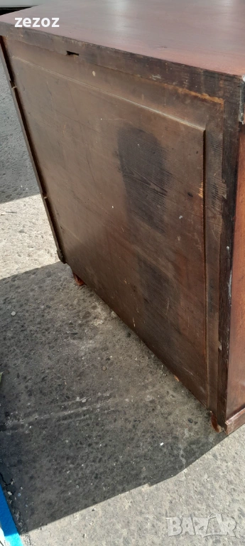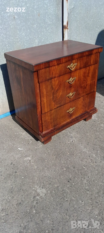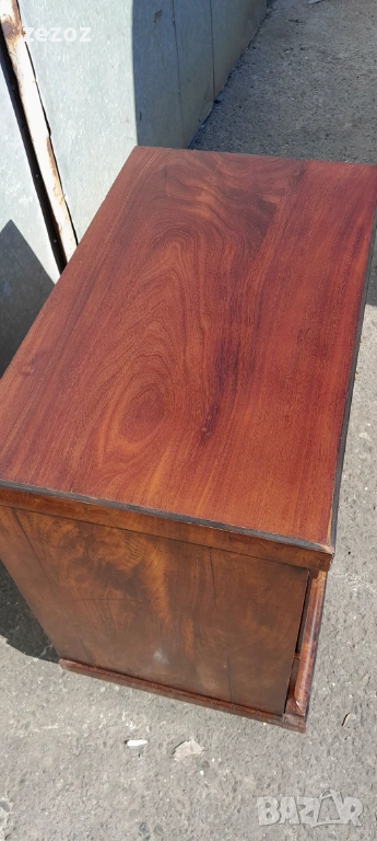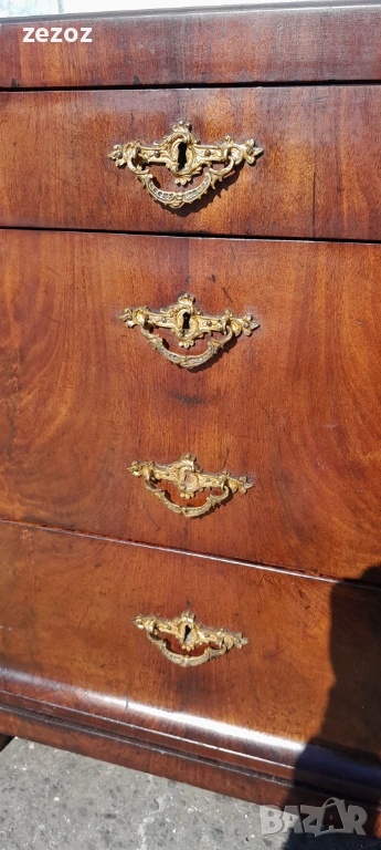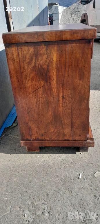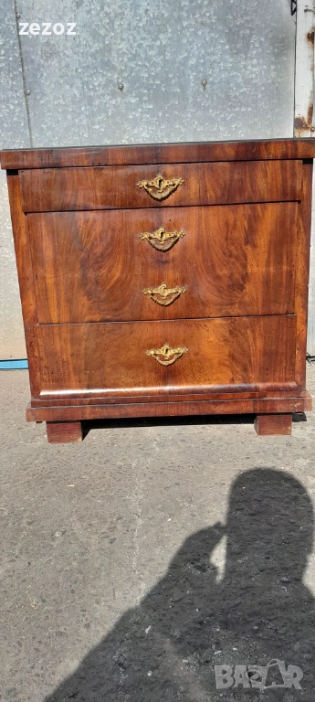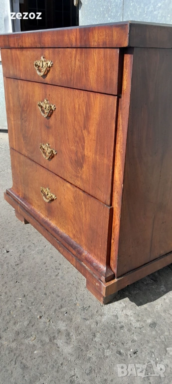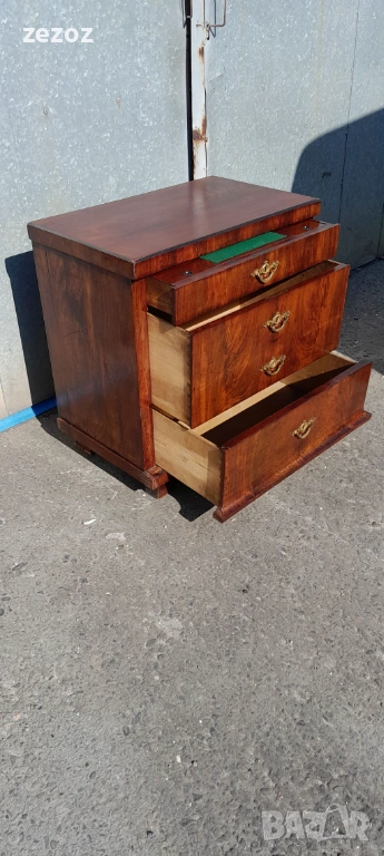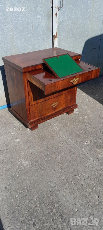 Едно рядко срещано антикварно писалище-около-1880-1890 г.Пълен масив покрит с махагонов фурнир.Горното чекмедже се превръща в плот за писане с две скрити отделения.Оригиналното покритие на плота.Месингов обков.Много добре запазен за възраста си.Габаритни размери-
