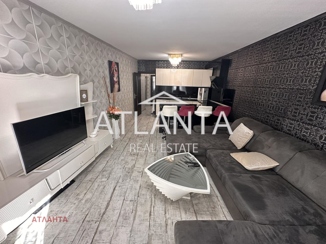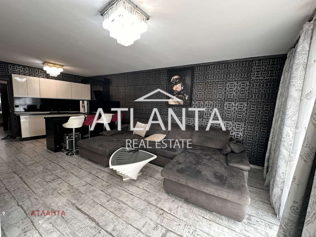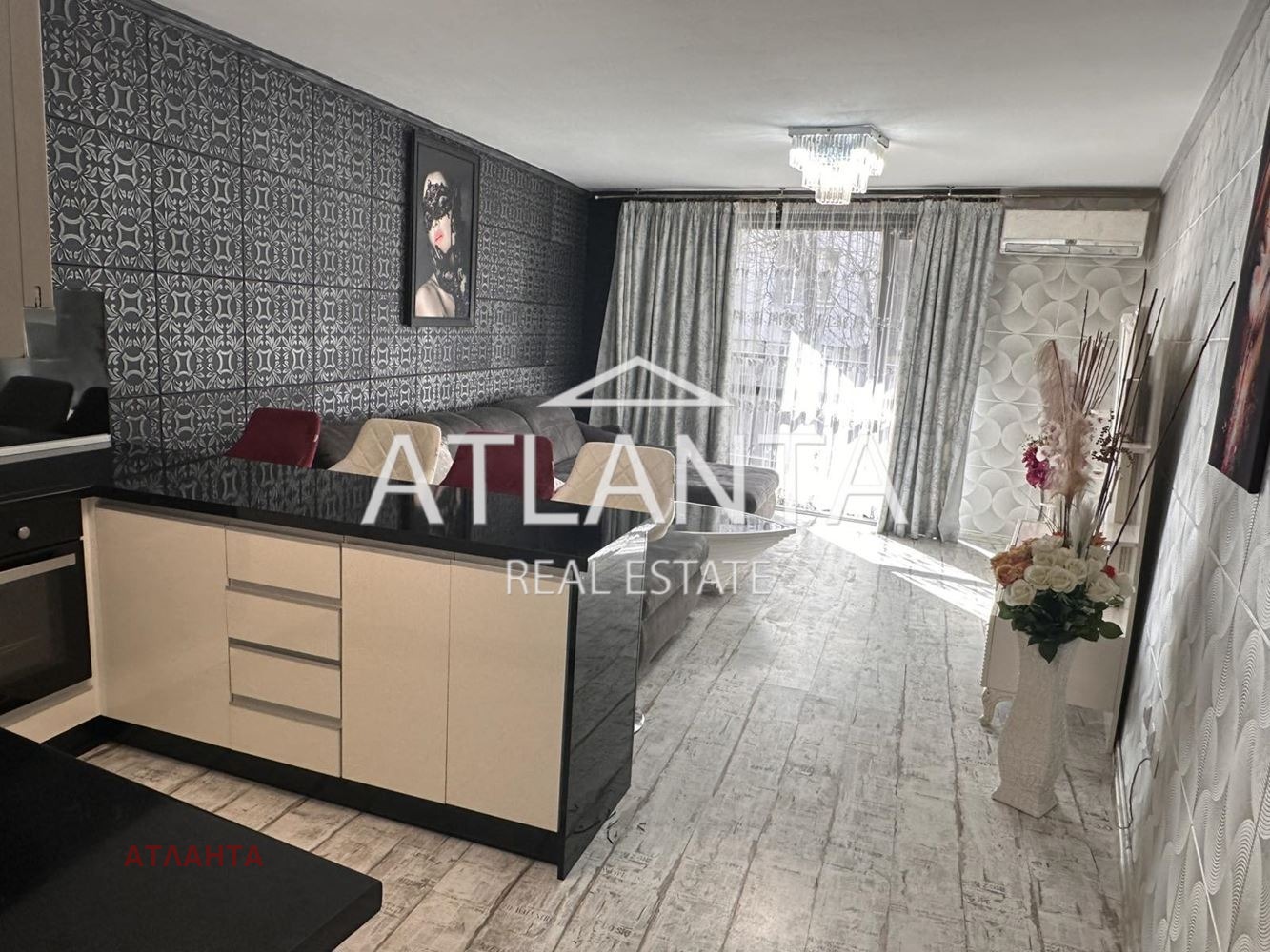 Апартаментът е новообзаведен и напълно оборудван, с климатици във всички помещения. Жилището впечатлява с контрастна и елегантна визия, съчетаваща тъмни декоративни стени с орнаменти, светли мебели с барокови линии и модерно осветление. Просторната дневна зона е решена като отворено пространство с кухня и бар-плот. Спалните са оформени с луксозни тапицирани легла с висока табла, декоративни стени и елегантно осветление. Интериорът е изпълнен с внимание към детайла, съчетавайки модерни материали, подбрани мебели и ефектни декоративни елементи.