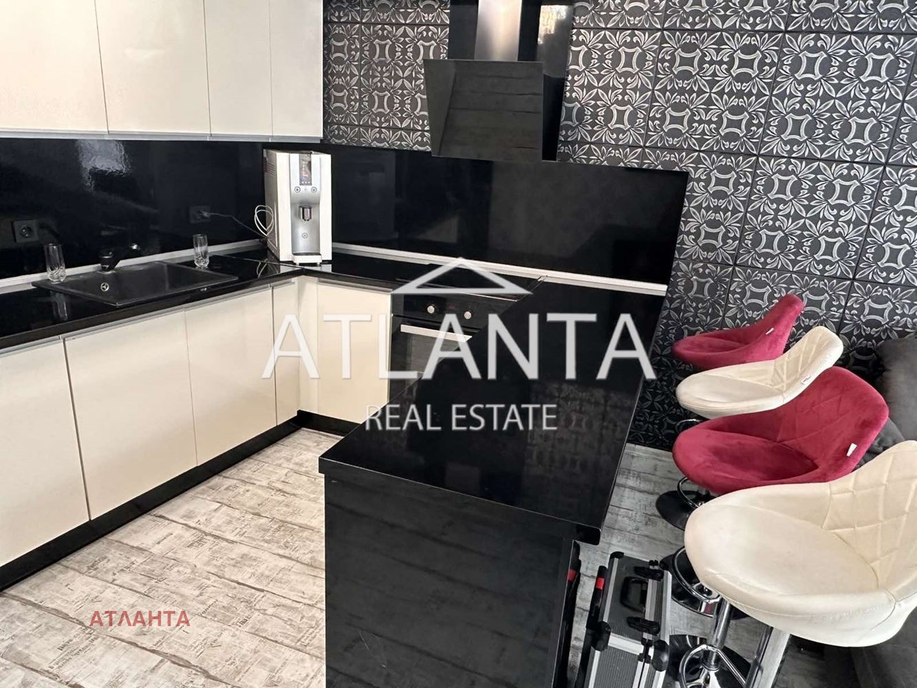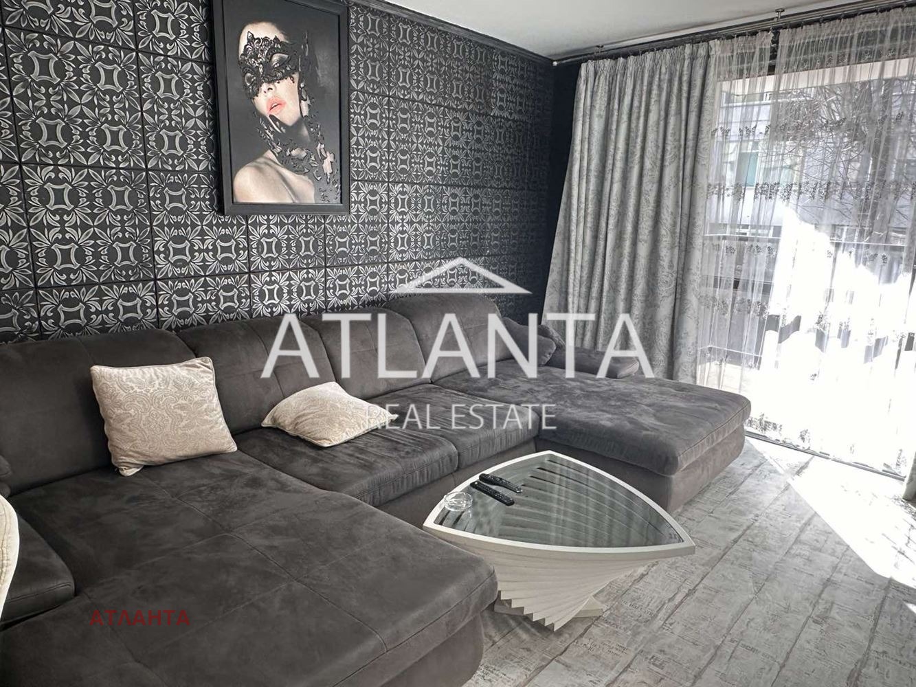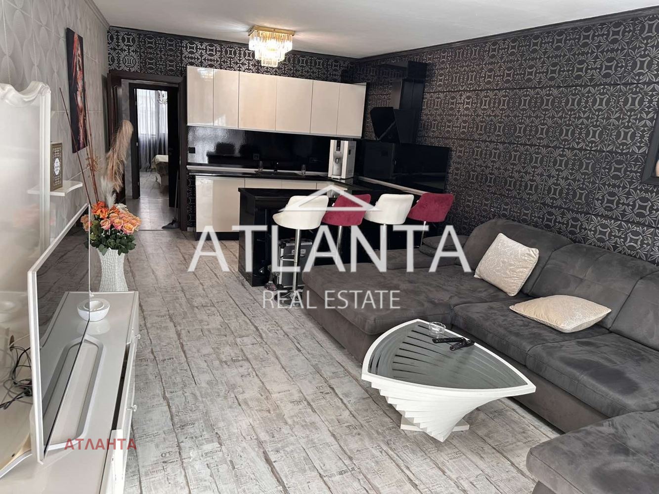 Апартаментът е новообзаведен и напълно оборудван, с климатици във всички помещения. Жилището впечатлява с контрастна и елегантна визия, съчетаваща тъмни декоративни стени с орнаменти, светли мебели с барокови линии и модерно осветление. Просторната дневна зона е решена като отворено пространство с кухня и бар-плот. Спалните са оформени с луксозни тапицирани легла с висока табла, декоративни стени и елегантно осветление. Интериорът е изпълнен с внимание към детайла, съчетавайки модерни материали, подбрани мебели и ефектни декоративни елементи.