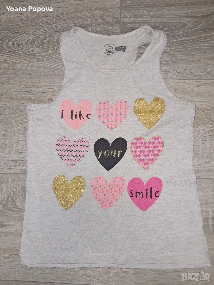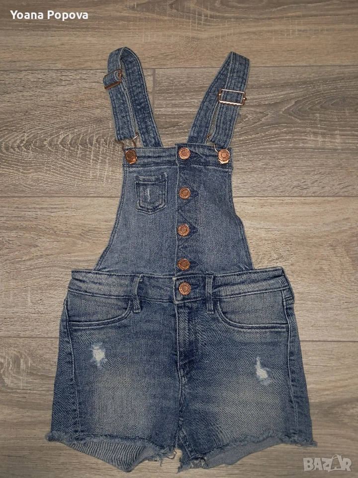 Продавам свеж и модерен летен комплект за момиче, подбран с много внимание. Комплектът е втора употреба, но е изключително запазен, без петна или следи от носене. Включва: -Дънков гащеризон (тип шорти): Светъл деним с модерен „избелял“ и леко накъсан ефект. С регулируеми презрамки и метални копчета отпред. -Тениска: Светлосива, памучна, с нежна апликация (златисто сърце), която идеално допълва денима. -Аксесоар: Ластик за коса (скрънчи) на сини цветя за завършена визия.