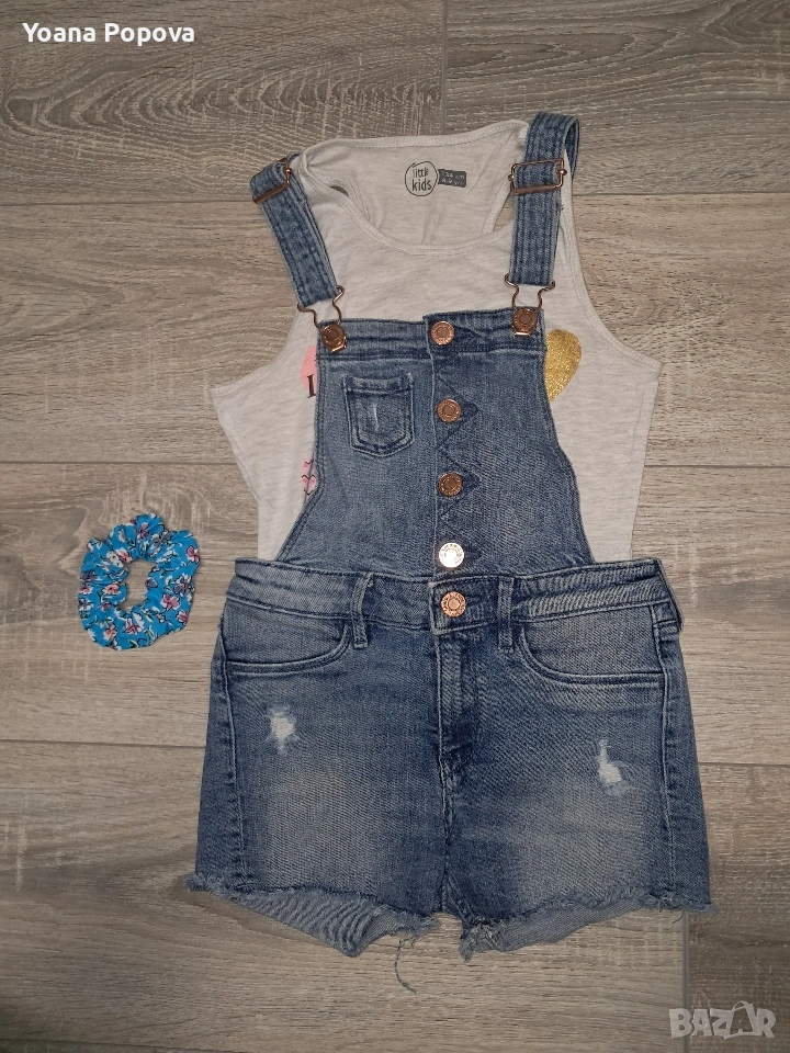 Летен детски комплект от 3 части: Дънков гащеризон, тениска и скрънчи → Обява 53956612