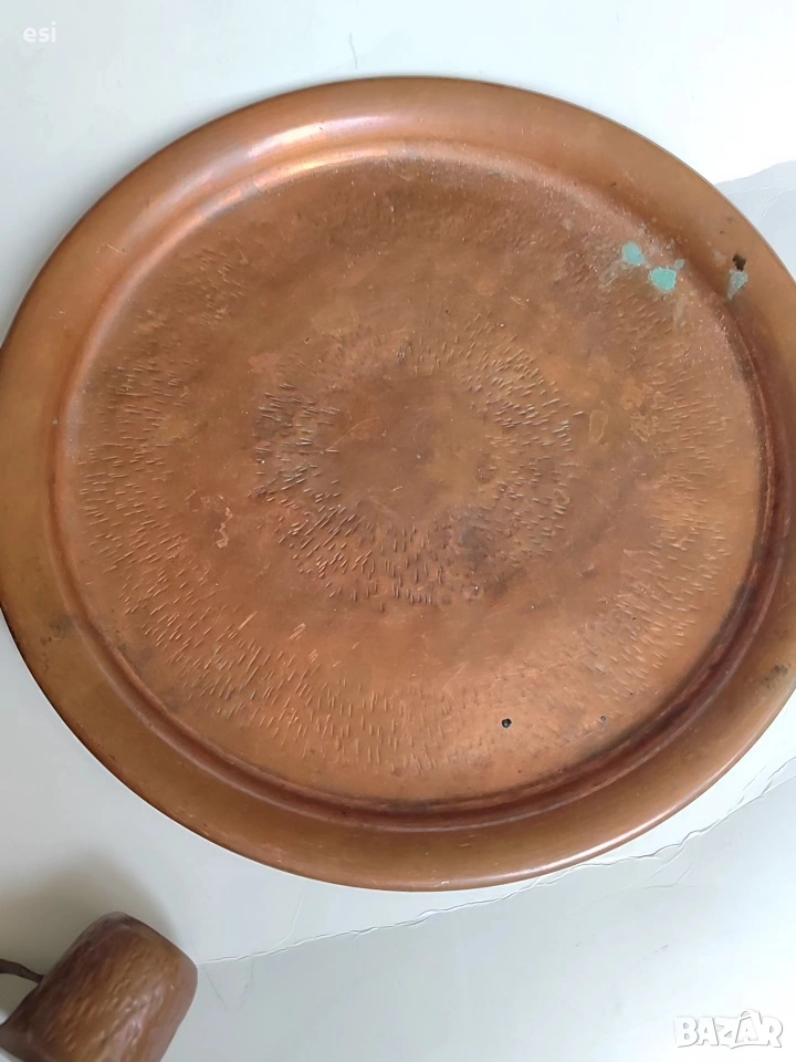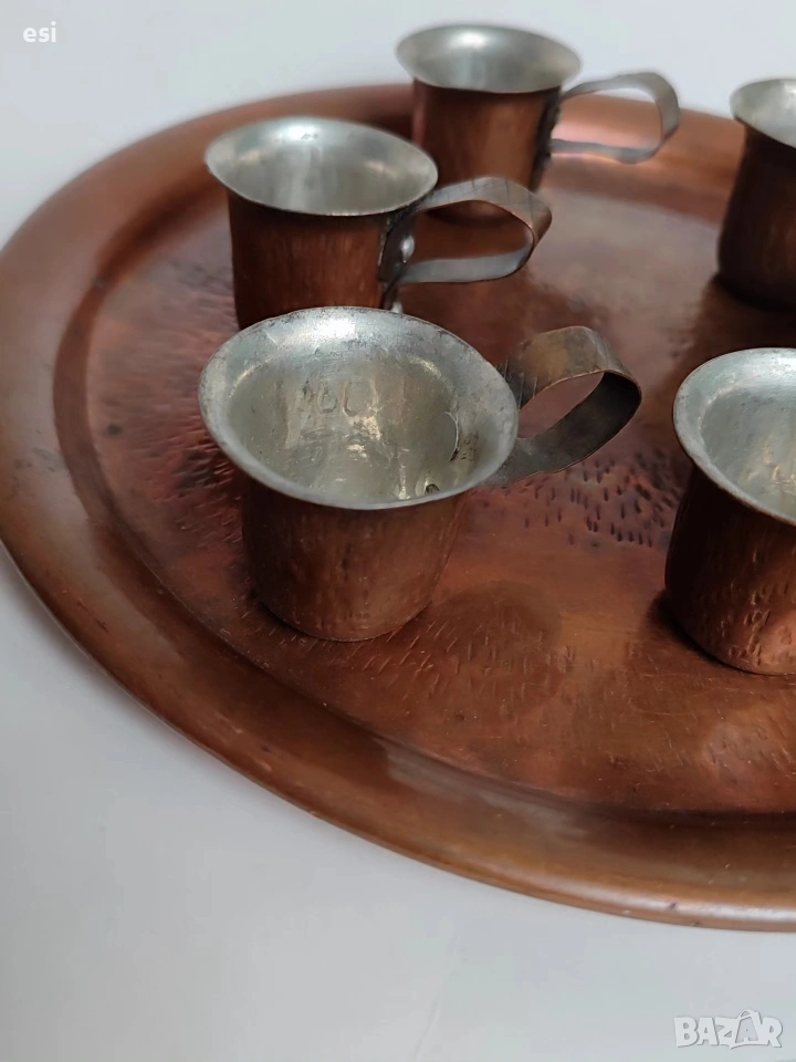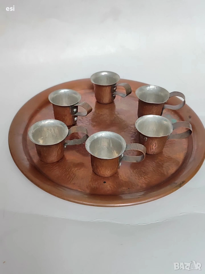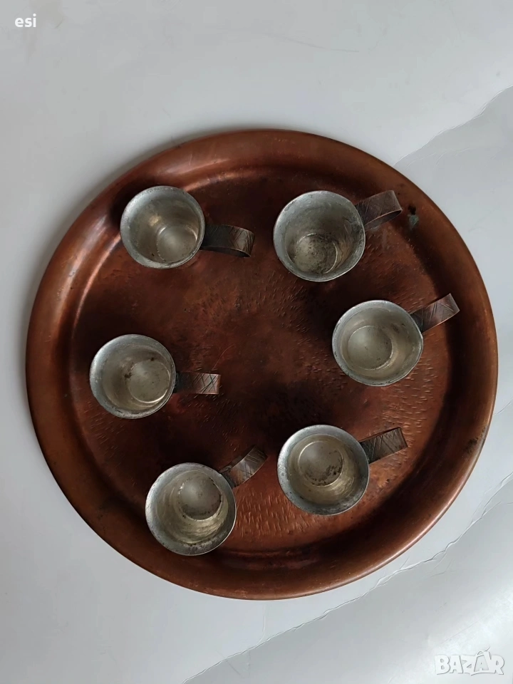Медно сервизче от едно време За греяна р@кия Поднос с размер 23,3 см Чаши с височина 3,2 см и вместимост 30 ml Цена 35 евро