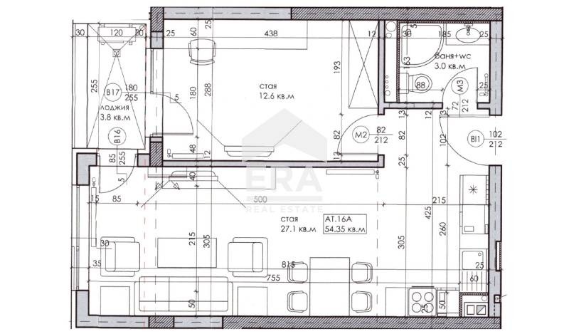 Апартамент 16А се състои от коридор, дневна с кухненски бокс и трапезария, спалня, баня с тоалетна и лоджия.