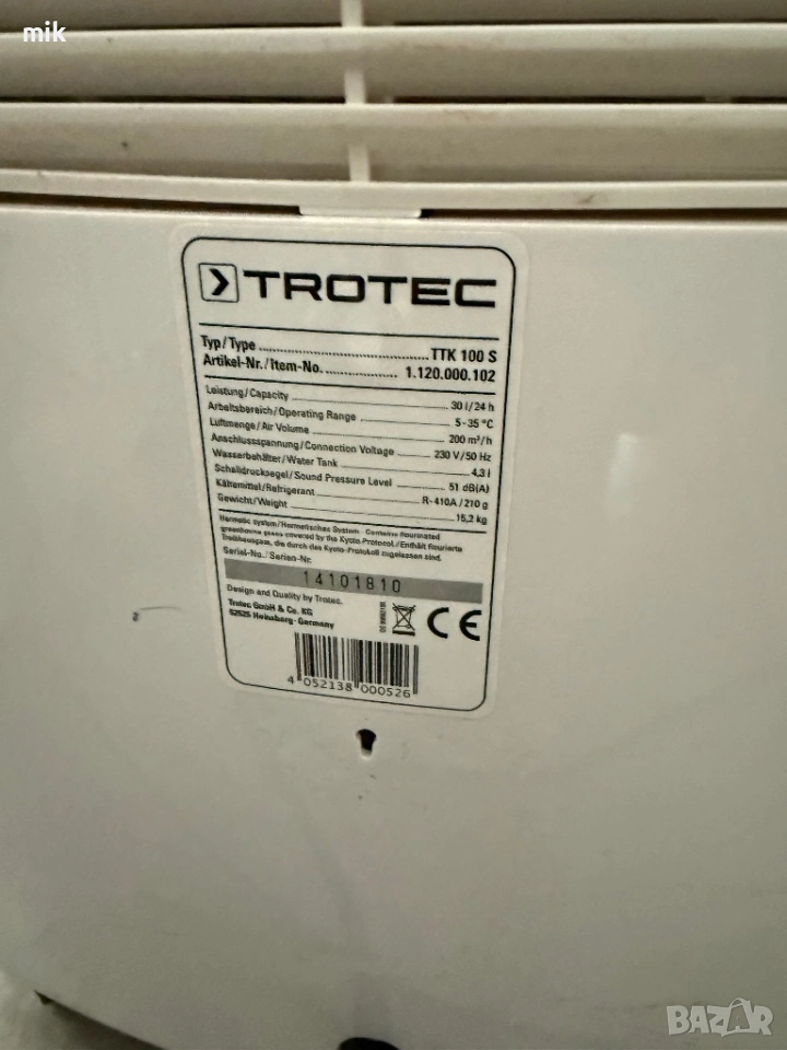 Производителност на обезводняване / 24 часа при 30 ° C и 80% относителна влажност: 28,4 литра