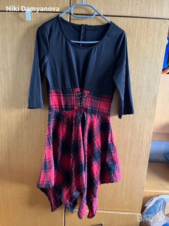 Продавам ефектна рокля в комбинация от черно и червено каре. Моделът е с 3/4 ръкав, асиметрична пола и акцент – корсетни връзки в талията, които подчертават фигурата.