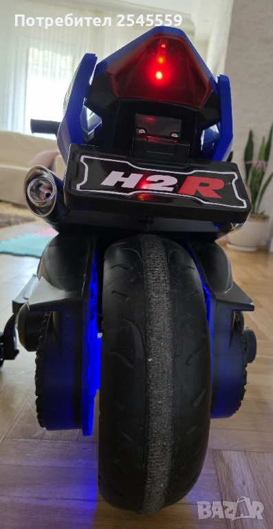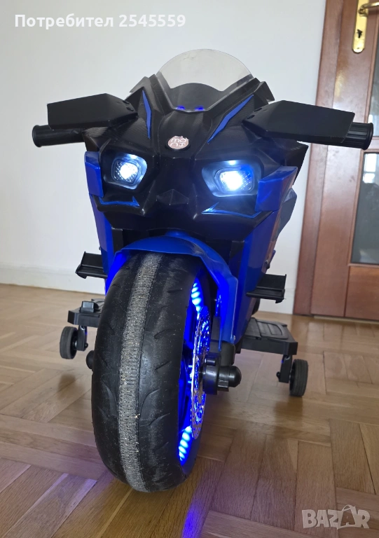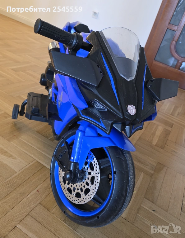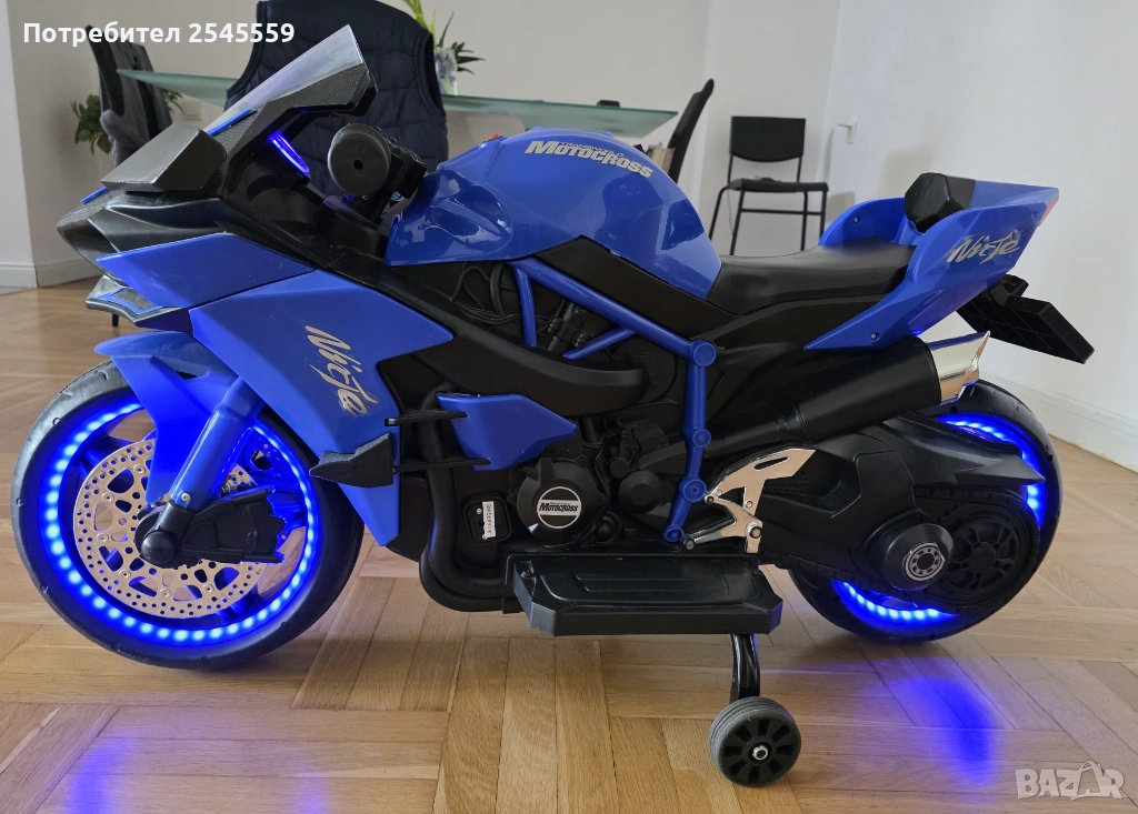 Акумулаторен мотор Ninja Duo, подходящ за деца от 3 до 8 години и максимално тегло до 30 kg. Моторът разполага с регулируема скорост чрез ръкохватката, потегляне от ръкохватката и музикален плейър и клаксон. Моделът има предни и задни светлини, и LED осветление на гумите. Гумите са пластмасови. Батерия: 12V7Ah. Максимална скорост: 7 km/h. Зарядно. Има следи от употреба. Възможен коментар на цената.