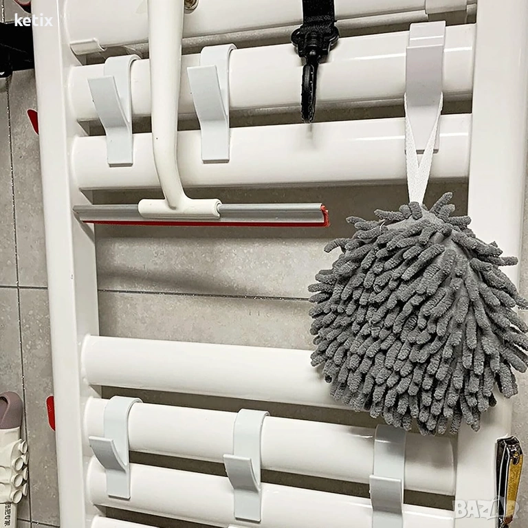 Вертикалните куки за кърпи за радиатори в обикновен бял дизайн са идеални за окачване на кърпи, халати и др. на кръглия радиатор, бойлер или душ кабина.