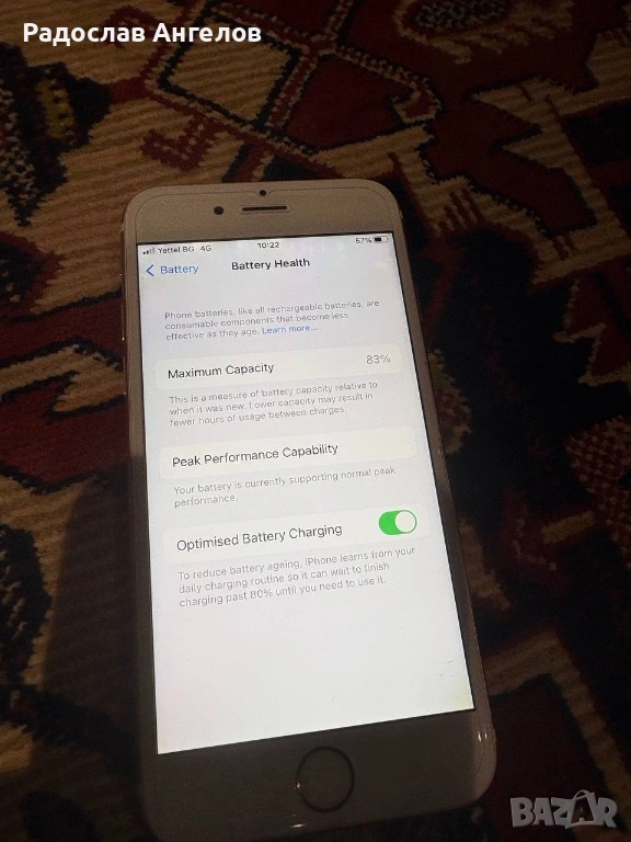 Батерия 83 % здравина, издържа цял ден при стандартна употреба; при интензивен мобилен интернет може да се наложи смяна за оптимална работа.