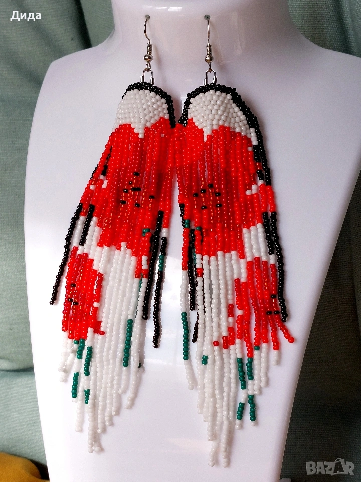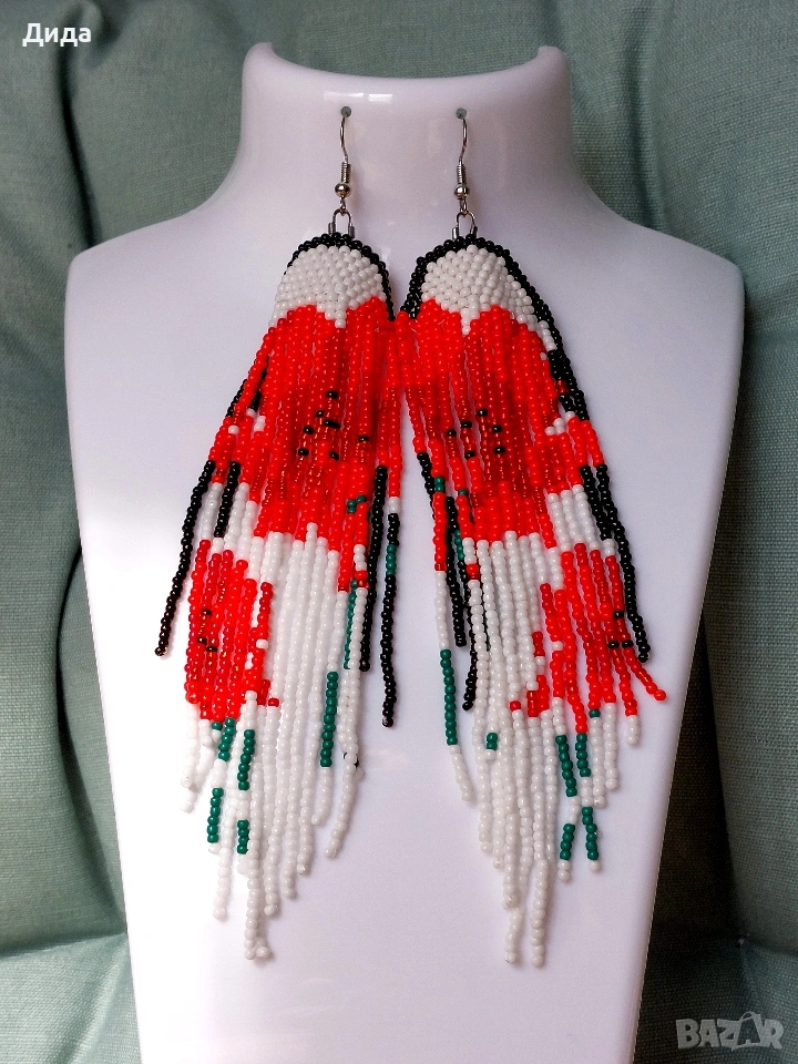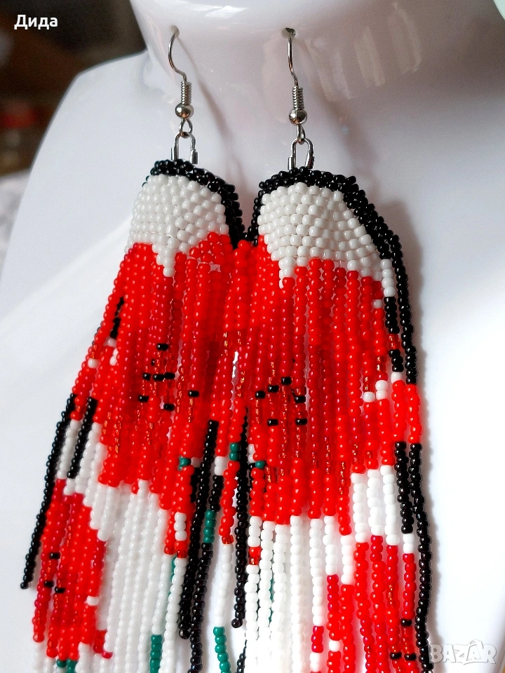 Продавам нови обеци, изработени със стъклени мъниста с фигура на красиви макове. Височина - 15 см. Ширина - 4 см.