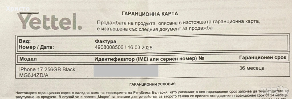 Закупен е на 16.03.2026 г. и е с валидна гаранция 36 месеца. Работи безупречно и е напълно отключен – съвместим с всички оператори.
