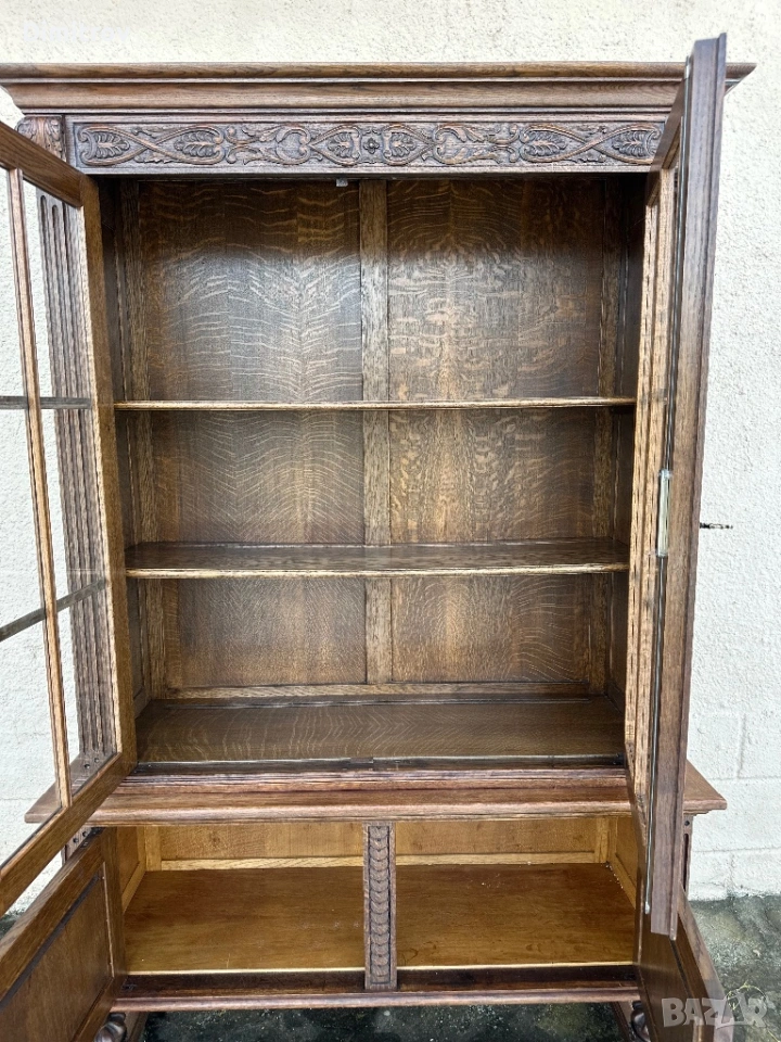 Масивна ретро витрина с дърворезба и стъклени врати