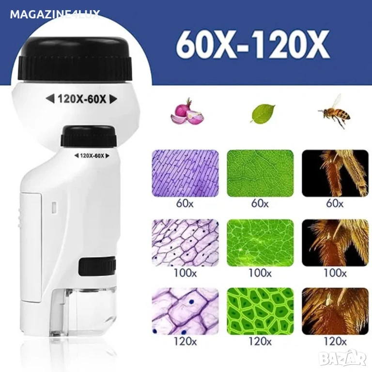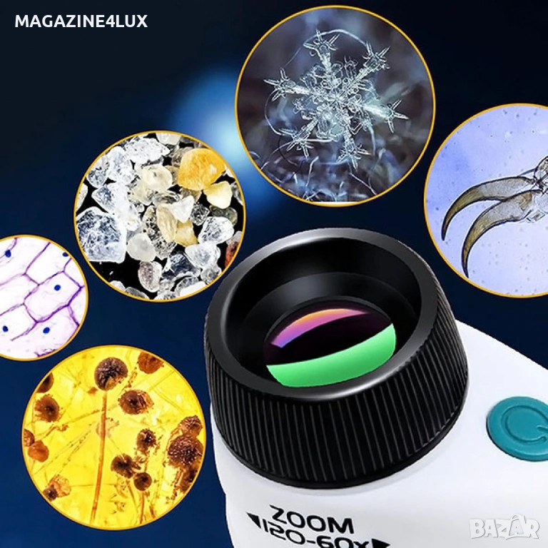 Преносим микроскоп с LED светлина, 60x-120x увеличение и стойка за смартфон