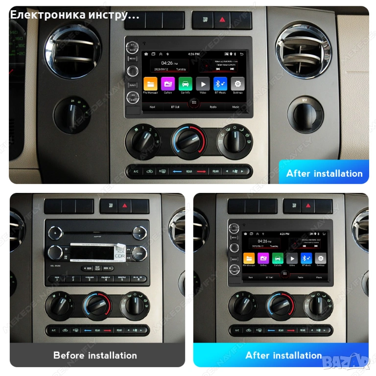 Монтира се на мястото на фабричното радио с подходяща рамка и кабели според конкретния модел. Системата осигурява бърза работа, стабилна GPS навигация и възможност за едновременно използване на карта и музика.