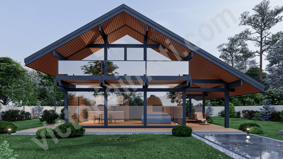 По отношение на архитектурата и разпределението предвидена РЗП от 194 кв.м., като на първи етаж са разположени 113 кв.м. от тях тук са функционално разпределени една огромна и просторна дневна, обособена на кътове кухненска, трапезарна и холова част, като разбира се зиданата камина в хола не е пропусната. Това общо помещение достига до впечатляващите 60 кв.м., и от него, разбира се, се излиза на уютна веранда. На това ниво ще откриете също входно антре, една гостна спалня, баня с тоалетна, мокро помещение, и стълбище към втория етаж.