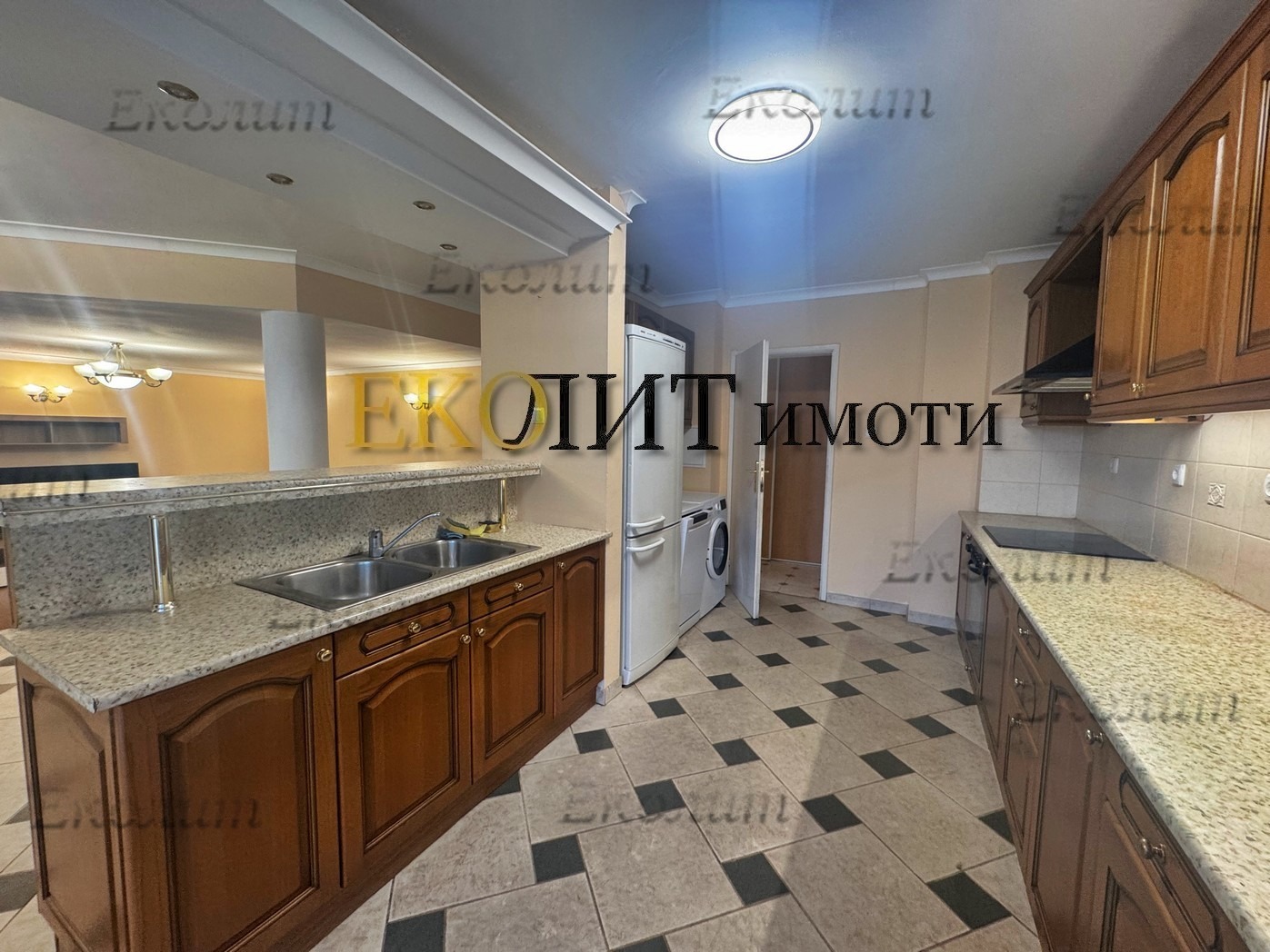 Обособен в отделна зона кухненски бокс с барплот и вградена кухня с уреди от висок клас, включително съдомиялна.