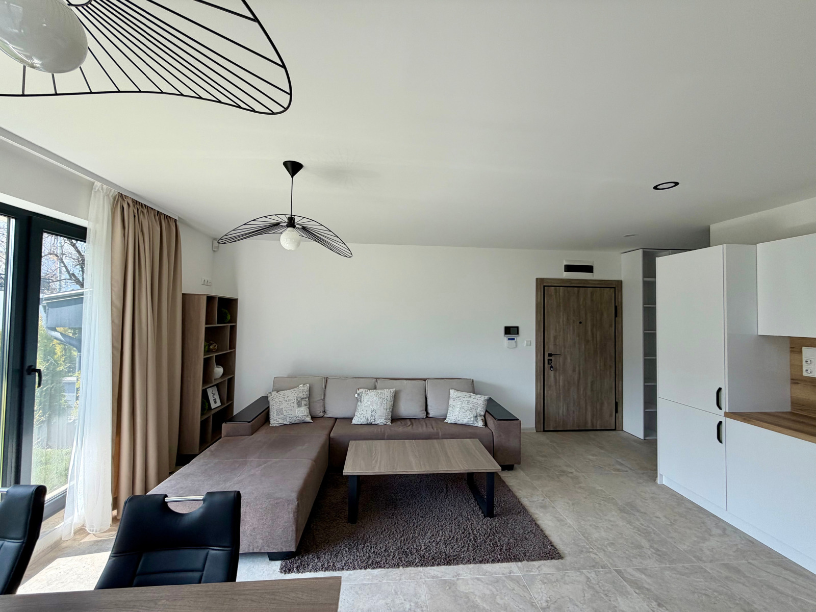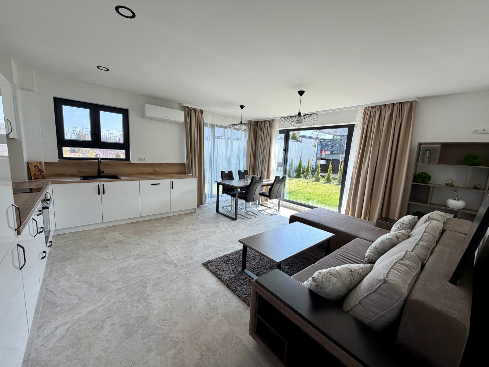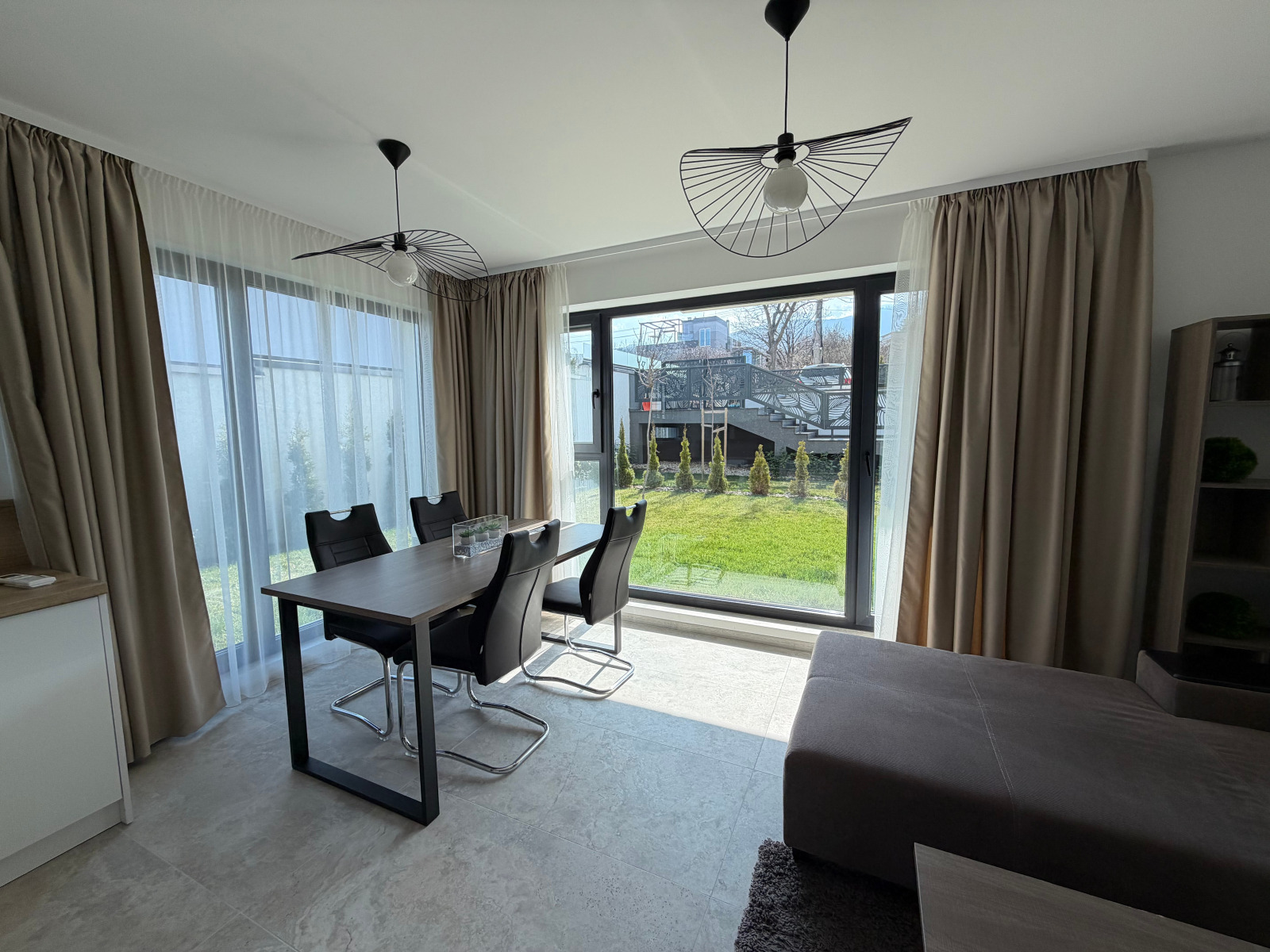 Предлагаме на вашето внимание апартамент ПОД НАЕМ - 3-стаен напълно обзаведен АПАРТАМЕНТ С ДВОР, ПАРКОМЯСТО И МАЗЕ. Имотът се намира на етаж 1 в новопостроена 3-етажна жилищна сграда, находяща се на адрес гр. София, кв. Симеоново, ул. 78, номер 9. Районът е изключително спокоен и тих, сградата се намира на малък асфалтов път на 3 мин от Ринг Мол. Апартаментът е просторен и светъл, изцяло ново обзаведен, с подово отопление на газ и климатици във всички стаи, с напълно озеленен двор с напоителна система, видео достъп и охранителна система. Площта на апартамента е 103кв.м., състои се от голямо общо помещение (хол, кухня и столова), коридор, две спални, две бани и обслужващо помещение. Наемната месечна цена включва апартамента с прилежащия му двор 153кв.м., мазе 15кв.м., паркомясто, такса поддръжка двор. Цената е 1350 евро без ддс, предлага се от фирма.