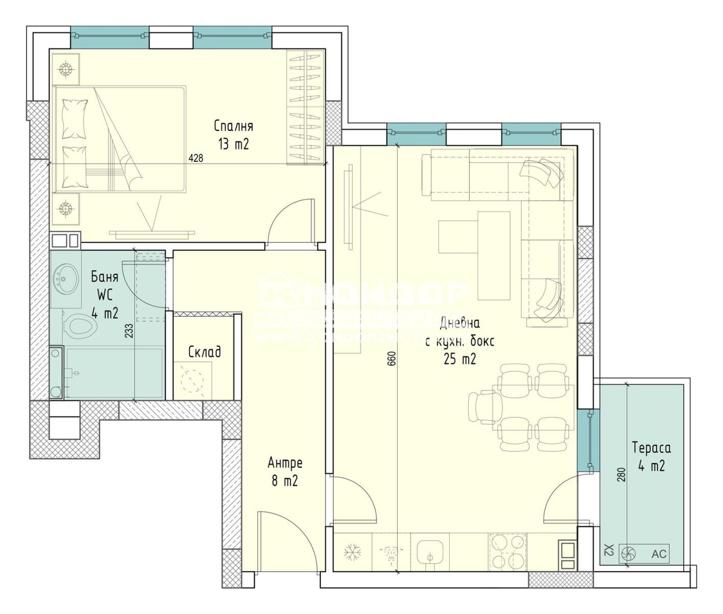Оферта 69092 - Предлагаме Ви възможността да си закупите ГОТОВО ЖИЛИЩЕ в един от най-иновативните и модерни комплекси, проектирани през последните години. Перфектното съчетание между цена, качество и локация, Луксозни екстри, задоволяващи всеки един каприз. Апартаментът се състои от ъглова дневна -25кв.м. с кухненски бокс и трапезария, самостоятелна спалня 13кв.м., баня с тоалетна, широко входно антре, перално помещение и една тераса към дневната. Високотехнологично строителство, като е заложено на водещи и наложени марки на пазара относно материалите, които ще бъдат използвани. Тухли - Wienerberger, система за покрив Ondulin, допълнителна висококачествена шумоизолация - Baumit, даваща Ви тишина и спокойствие, многокамерна дограма - Etem с троен стъклопакет 4-сезона с монтирани външни ел. щори за Вашият комфорт и лично пространство. Чиста, светла височина от 2.80м., даваща простор и обем на Вашите жилища. Умни камери с лицево разпознаване, както и 24/7 подсигурена жива охрана, ще се грижат за Вашето спокойствие. Проектиран е просторен вътрешен двор с озеленена площ , места за отдих между жилищните секции с пейки, детски и кучешки площадки, както и открито пространство за спорт. Комплексът е свързан с голям възлов булевард и е на метри от големи търговски вериги и молове, ресторанти и развлекателни заведения.
