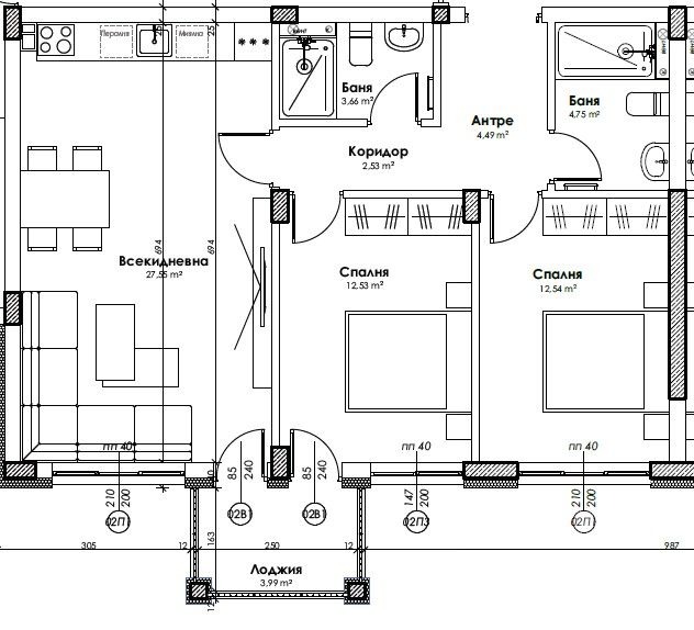 Апартаментът е ситуиран на 4-ти от 5-ти жилищен етаж и разполага с площ от 93кв.м., разгърната по следния практичен начин: входно антре, всекидневна, две спални, две бани с тоалетни, лоджия. Има възможност за закупуване паркомясто на стойност 8 000 евро.
