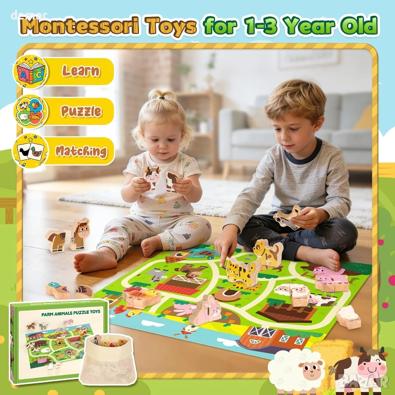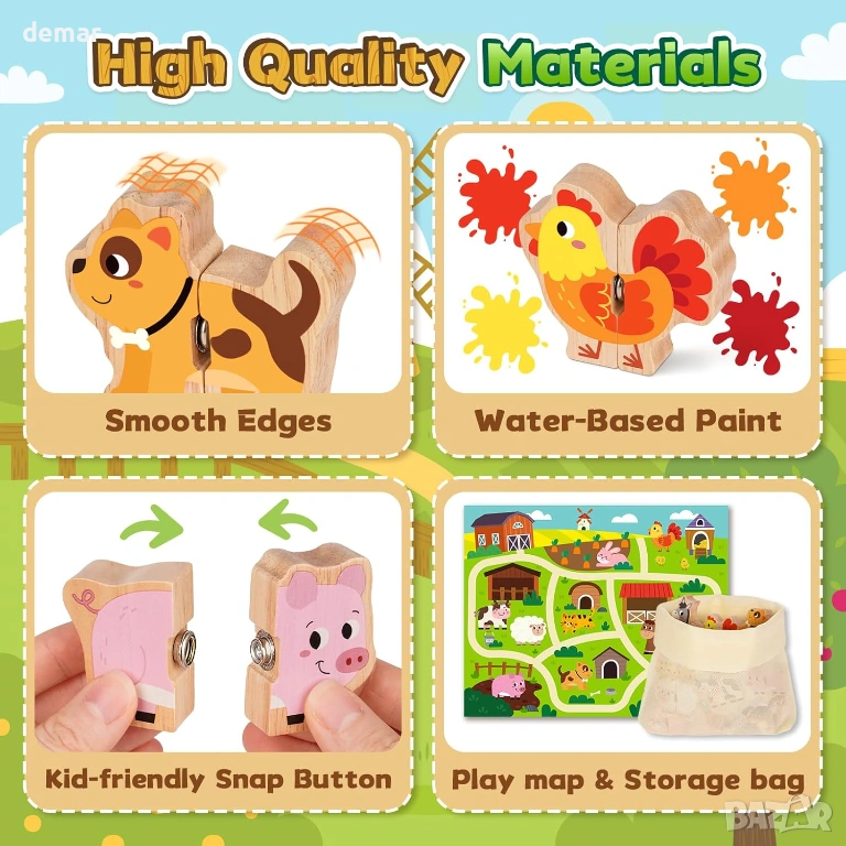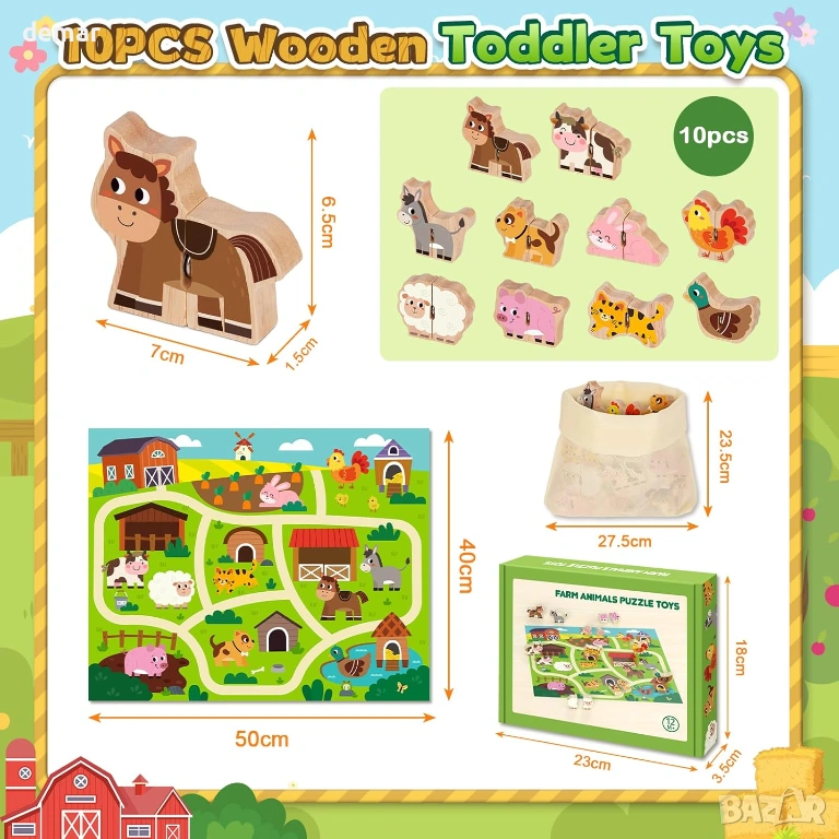 Този дървен комплект за съчетаване на селскостопански животни включва 10 двукомпонентни пъзела с животни, тематична подложка за игра и чанта за съхранение, предназначени да създадат ангажираща среда за игра за малки деца на възраст 1-3 години. Изработен от масивна дървесина с нетоксична боя на водна основа, той се отличава с гладки повърхности и заоблени ръбове за безопасно боравене, както и със здрави съединители за сигурно сглобяване. Играчката подпомага ранното развитие, като насърчава разпознаването на цветове, идентифицирането на животни, имитацията на звук и изграждането на речник чрез интерактивна игра. Нейният опростен дизайн със защракване помага за подобряване на фините двигателни умения, координацията око-ръка и основните умения за решаване на проблеми. Лек и преносим, той е подходящ за употреба у дома или по време на пътуване и служи като образователен подарък за различни поводи.