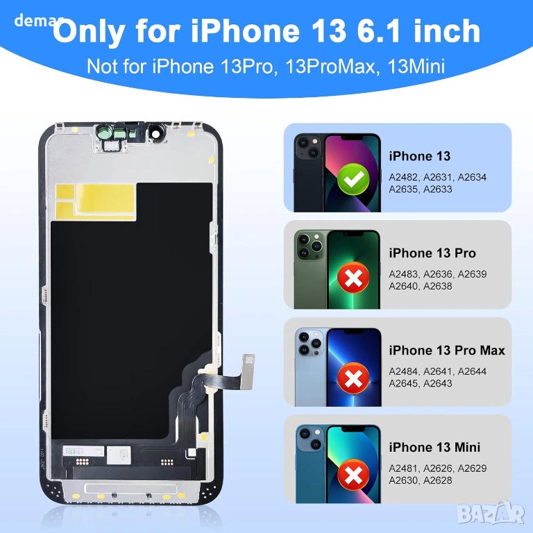 Проектиран специално за моделите iPhone 13 (6,1 инча) (A2634, A2635, A2636, A2639), този заместващ екран ефективно решава често срещани проблеми като пукнатини, мъртви пиксели, липса на чувствителност при докосване и обезцветяване на дисплея, възстановявайки пълната функционалност. Всеки модул е щателно тестван предварително преди доставка, включително производителността на Haptic Touch, за да се гарантира надеждна работа след монтаж. Комплектът включва пълен комплект екран, заедно с основни инструменти за ремонт, водоустойчиво уплътнение, протектор за екран и подробна блок-схема, което го прави подходящ за ремонти в домашни условия, с указания за следване на специфични за модела видеоклипове за монтаж за оптимални резултати.