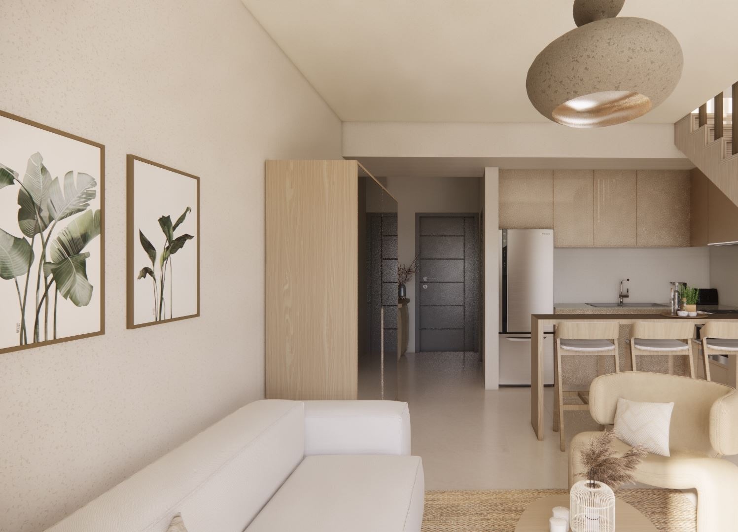 На първи етаж се намират дневна с кухненски бокс в отворено пространство, баня и частен двор.