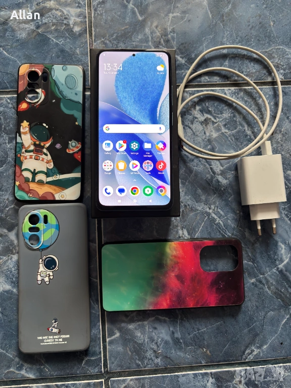 Върви с оригинално бързо зарядно и кабел, както и с кутията и всичките документации и стикери.