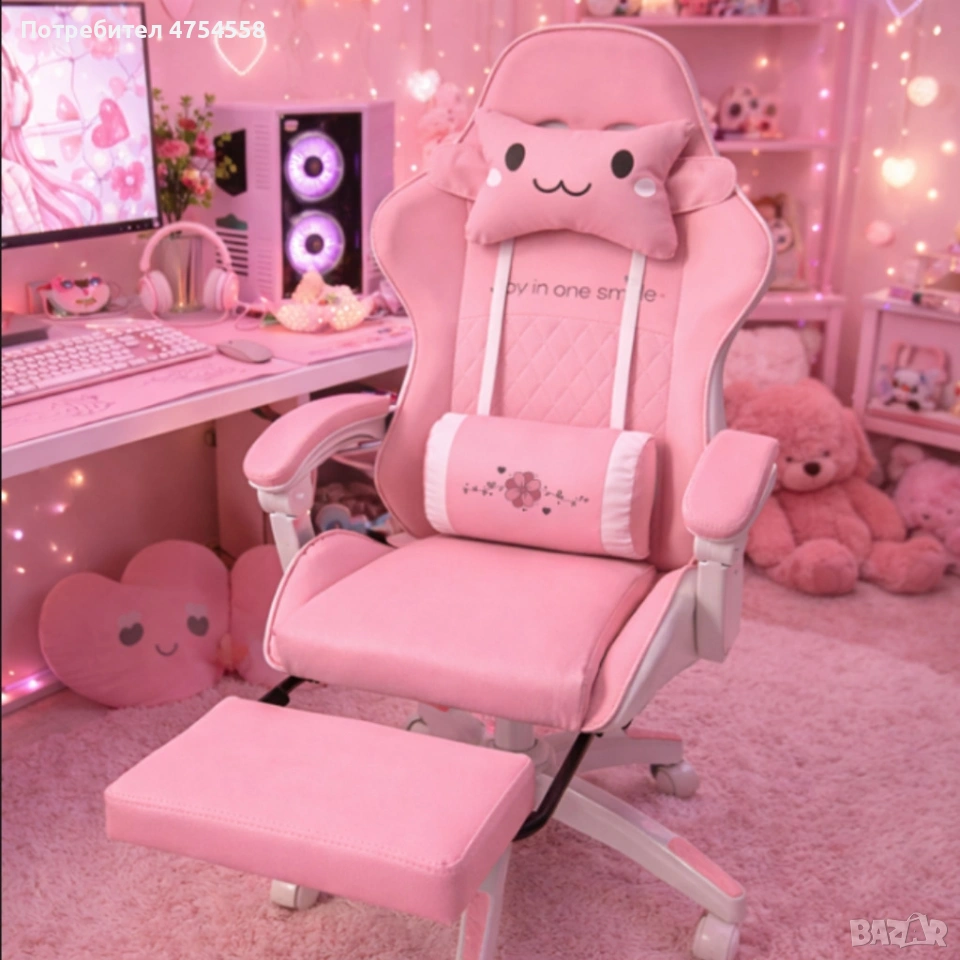 Ергономичен розов геймърски стол с поставка за крака - регулируема облегалка и 2 възглавници → Обява 53961109