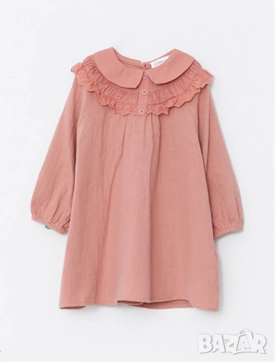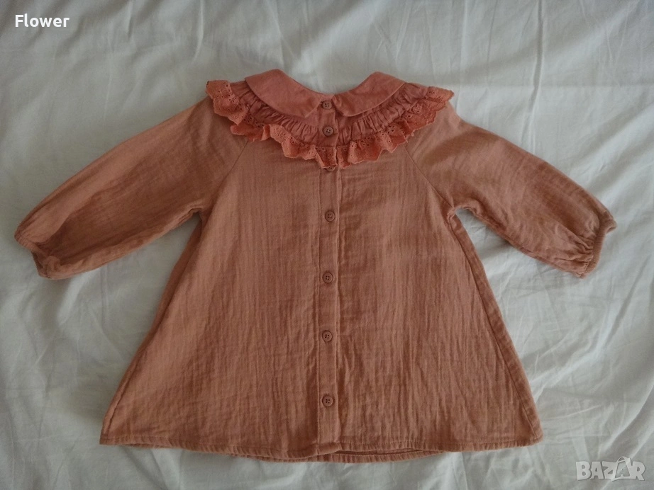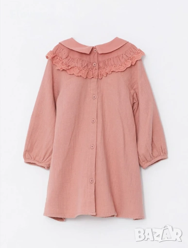 Рокля с трапецовидна кройка от мек муселин от памук с кръгло деколте и вълнообразна яка с английска бродерия. С декоративни копчета на предницата и копчета с отвор на гърба. Дълги ръкави с тесни покрити ластици в краищата. Без подплата.