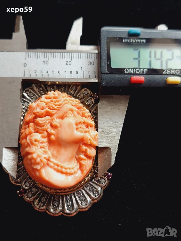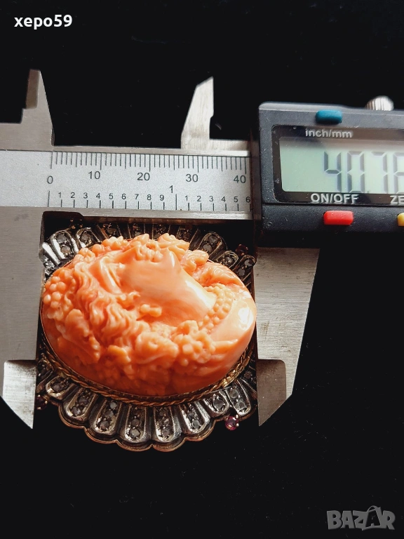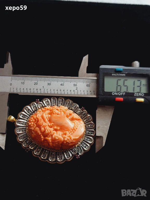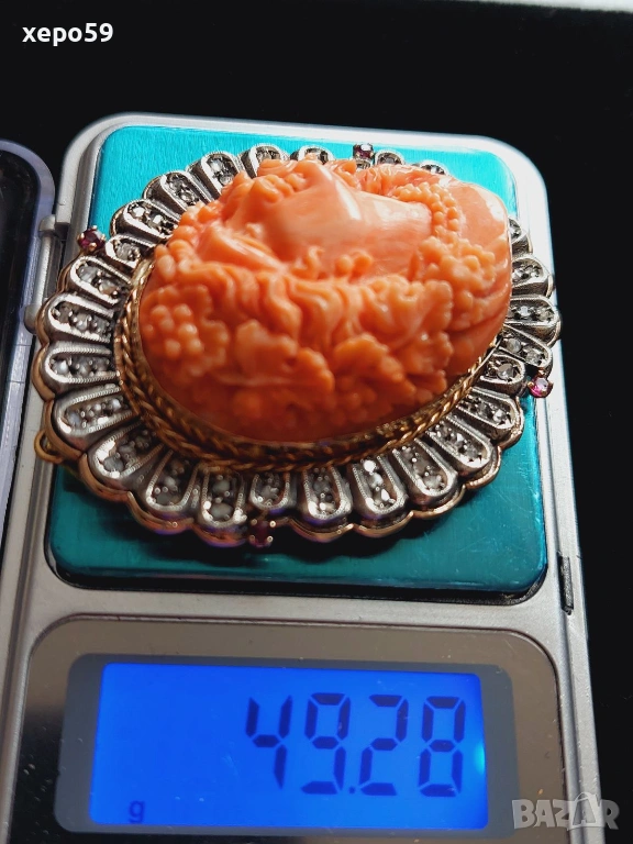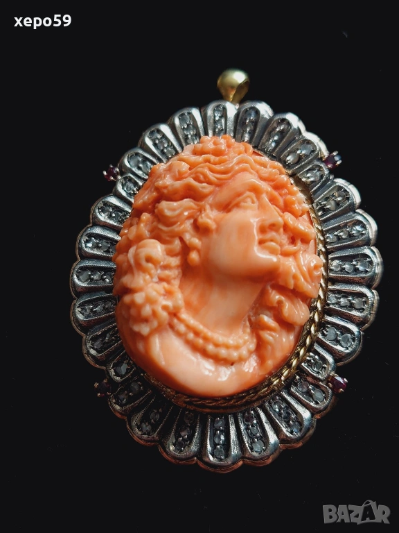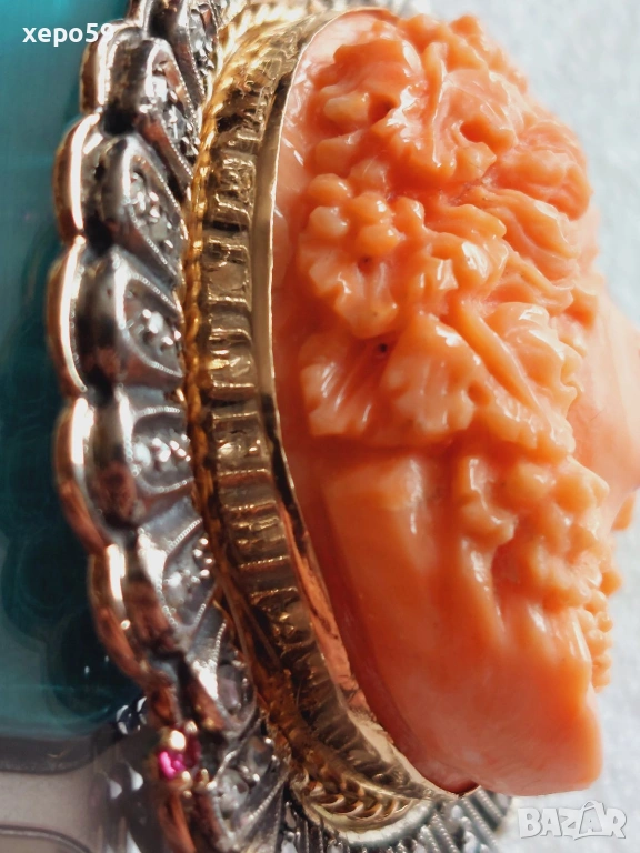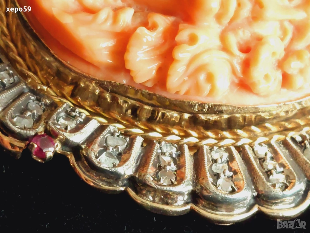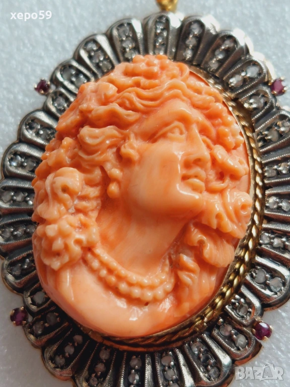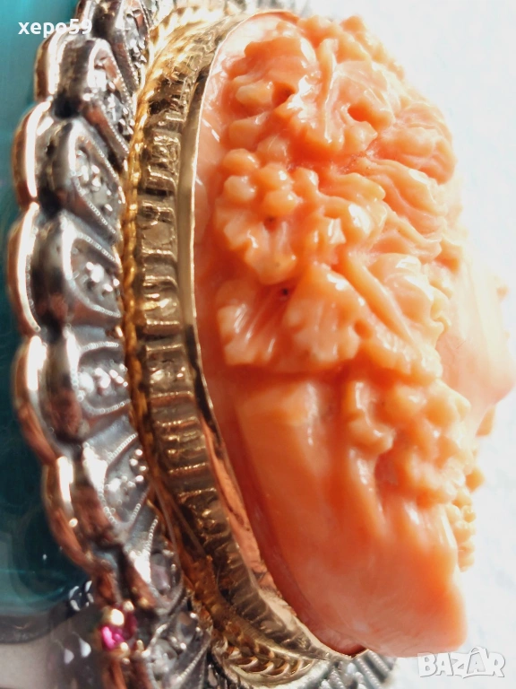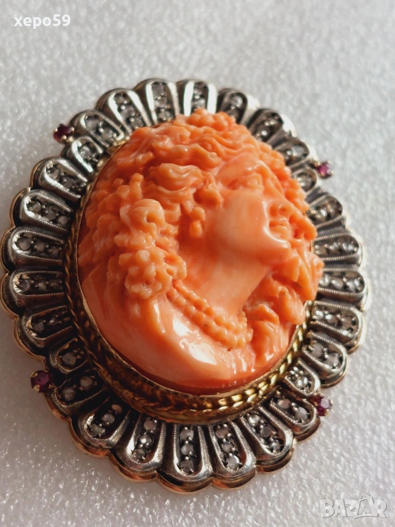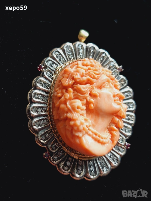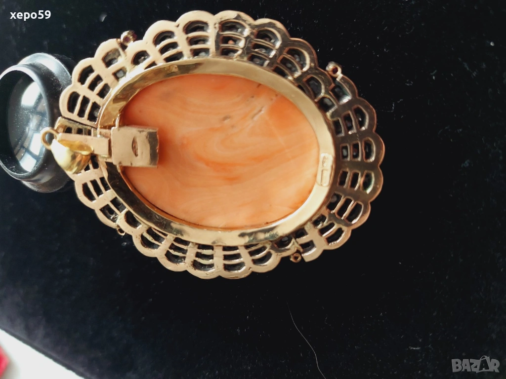 Прекрасен стар златен медальон с огромна коралова камея и 64 диаманта,злато 18к. → Обява 53961888