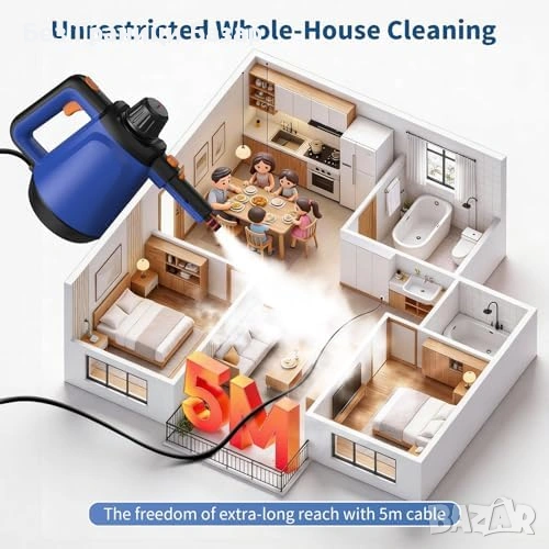 Дълъг 5-метров кабел за удобно почистване в няколко помещения