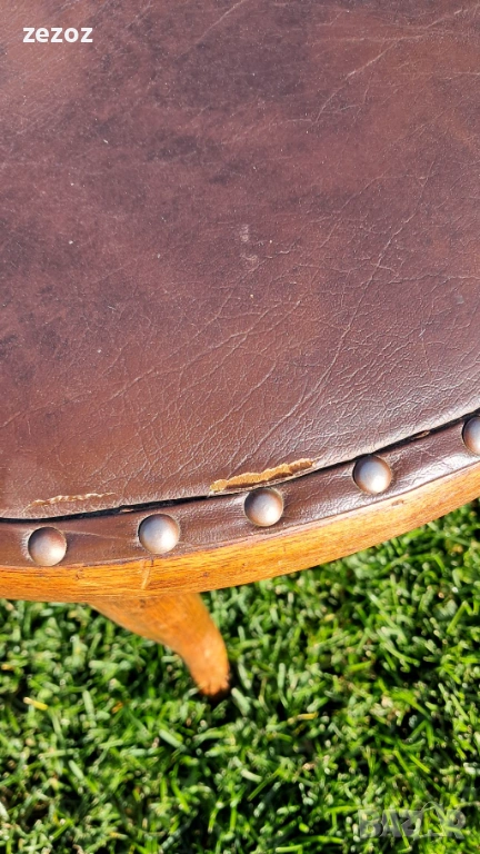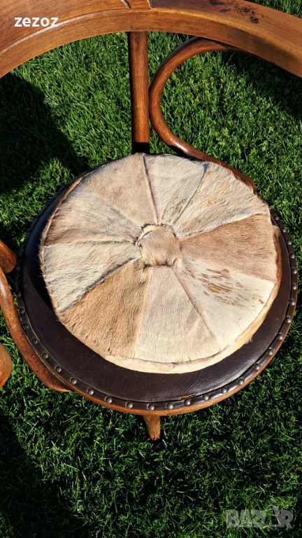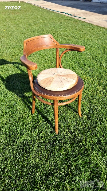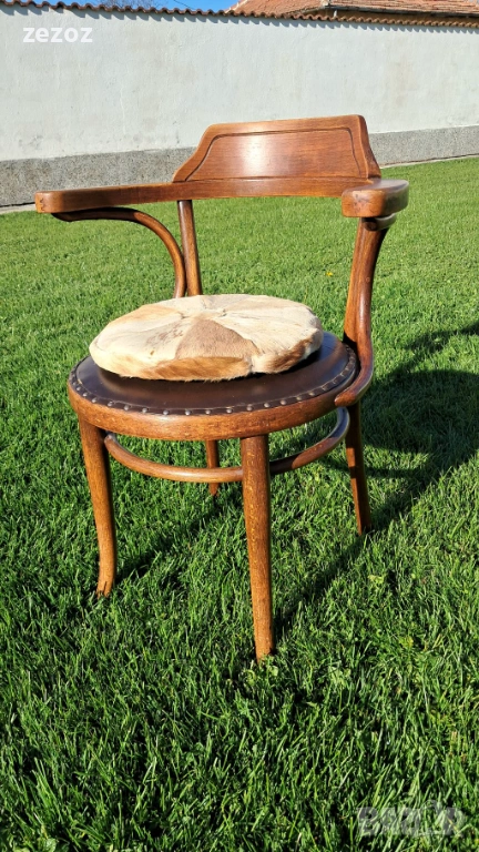 Антикварен оригинален стол за бюро THONET.С каталожен №6003.От края на 19 началото на 20 век.GEBRUDER THONET има остатък от етикет с логото,както и печат THONET на основата на седалката-снимано.Стола е конструктивно здрав.По каталог е бил с ратанова седалка,но през годините е подмена с кожена,която има забележка.Леко пукване на дървото на единия подлакътник-снимано.Продава се с възглавничката,която е от естествена кожа.